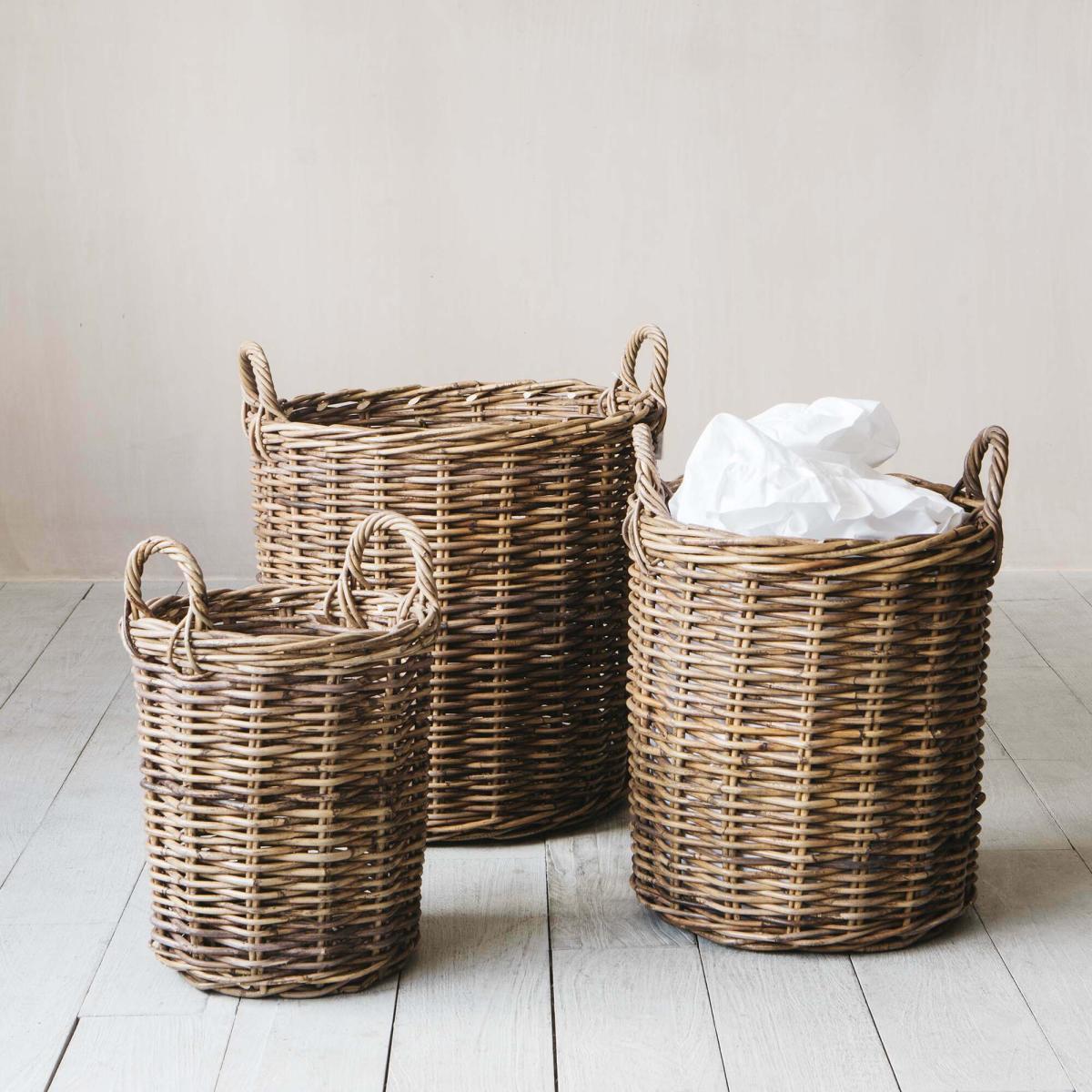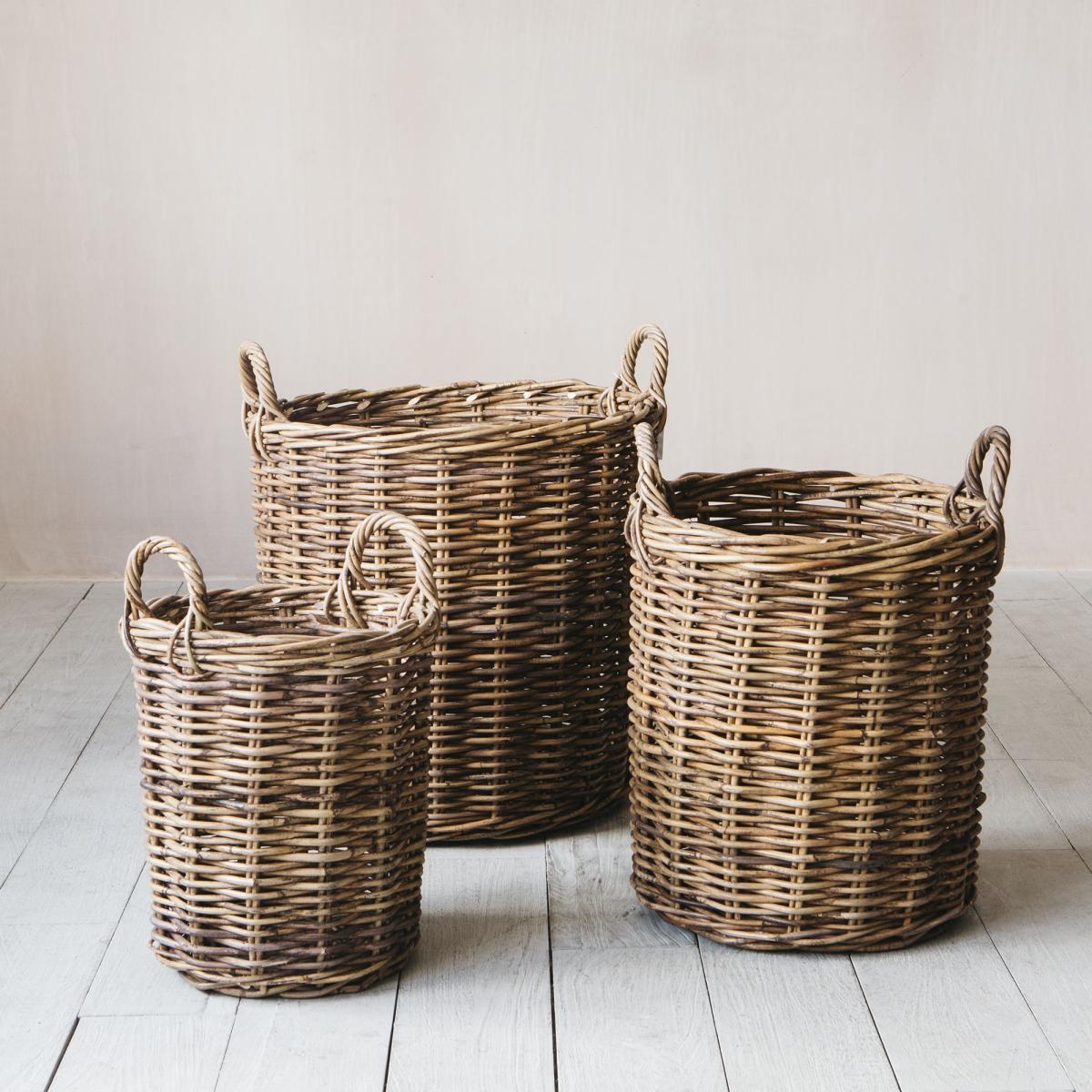 A set of three baskets handwoven in natural rattan, a stylish storage solution for the French provencal home.