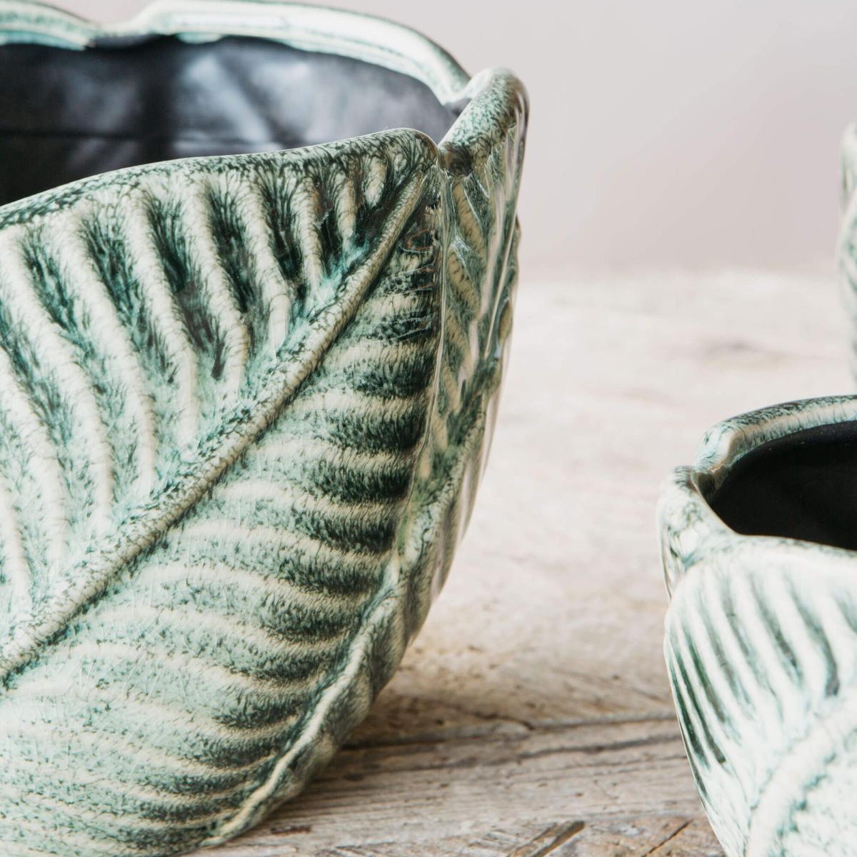 Wrapped in a wide leaf design and made from ceramic, this set of three planters is perfect for collating your houseplant or herb collection.