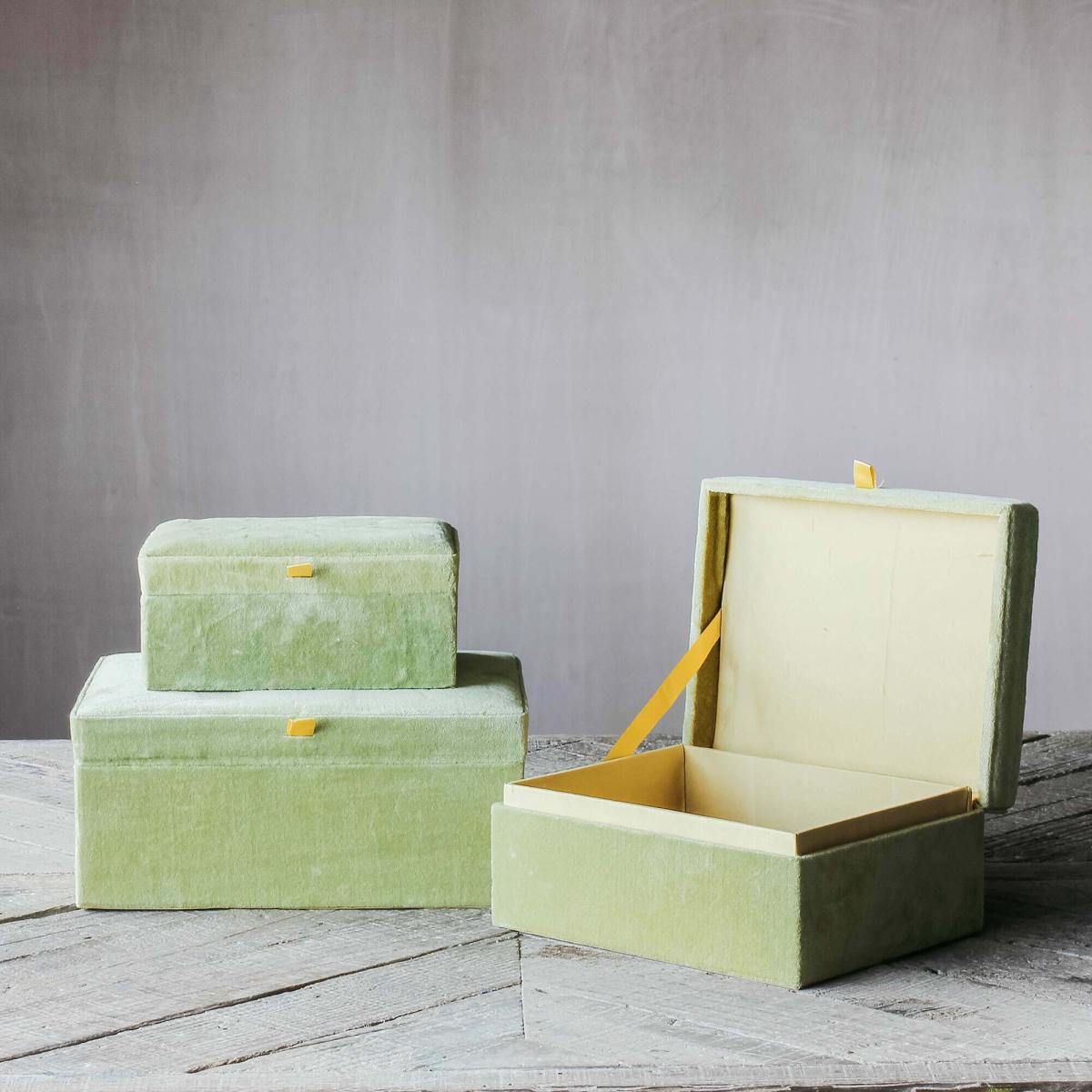 A set of three rectangular boxes handmade by talented artisans and finished in sumptuous light green velvet. Perfect for storing your keepsakes and treasures.