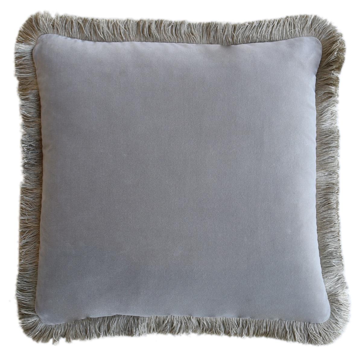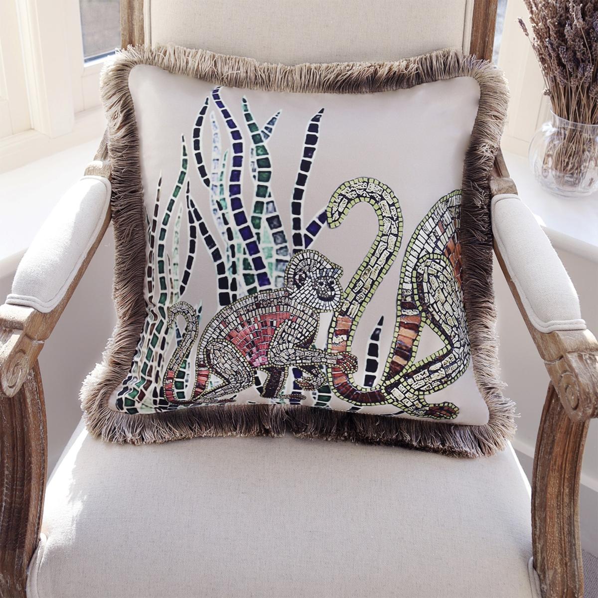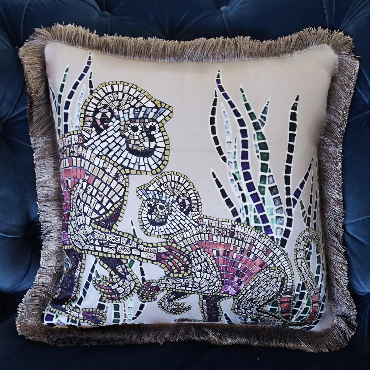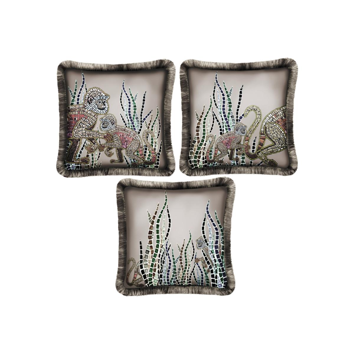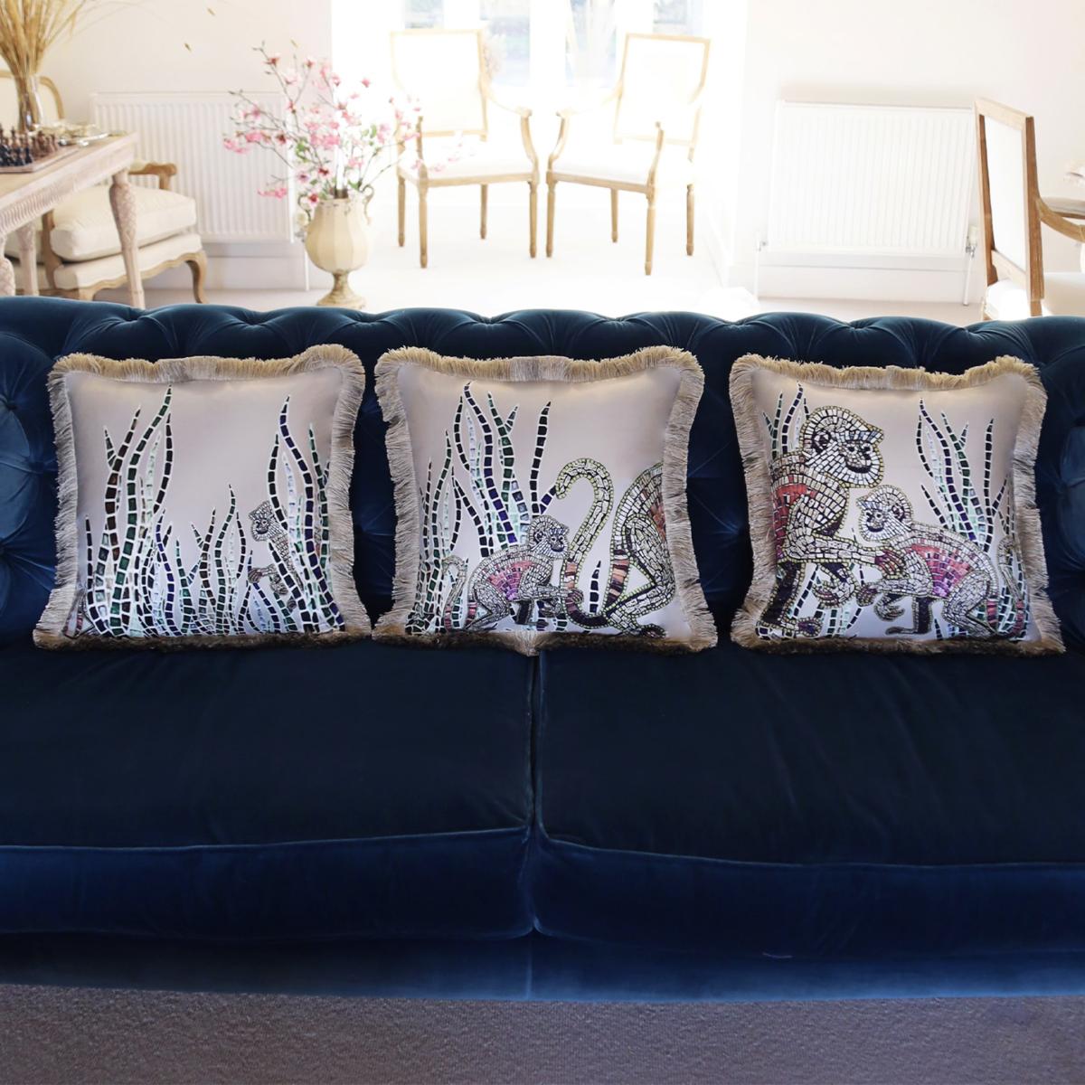 The full set of three luxury silk cushions at a discounted price. A mother and baby monkey, peer through long grass in this rich coloured, detailed print, created with mosaic tiles on thick golden beige 100% silk. Backed with smooth velvet and lavish sheen fringing. European duck feather cushion pad included. Our duck feather cushions are approved under the IDFB quality control. (The International Down and Feather Bureau).