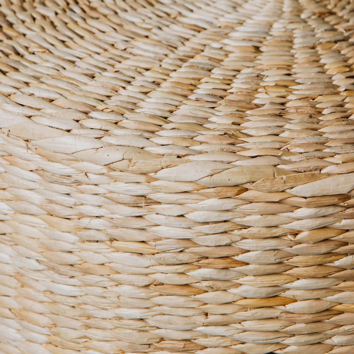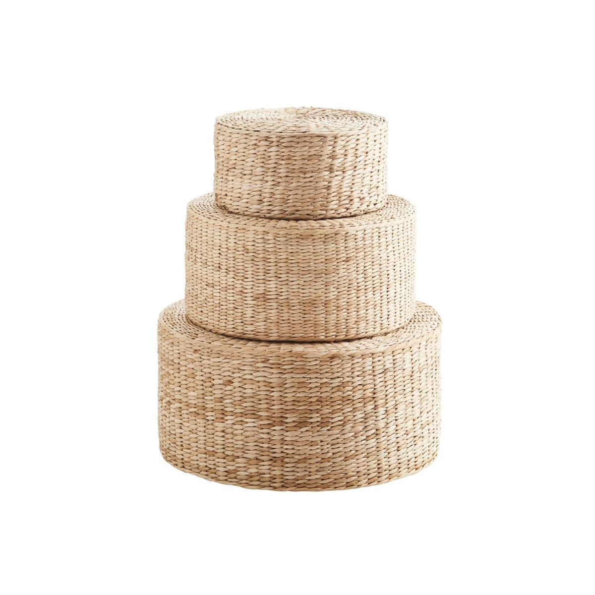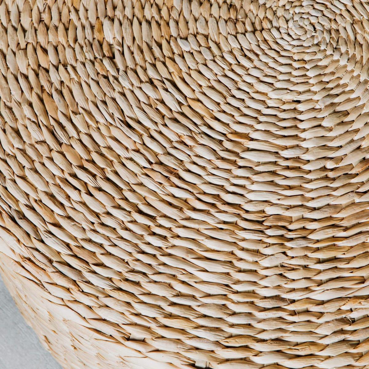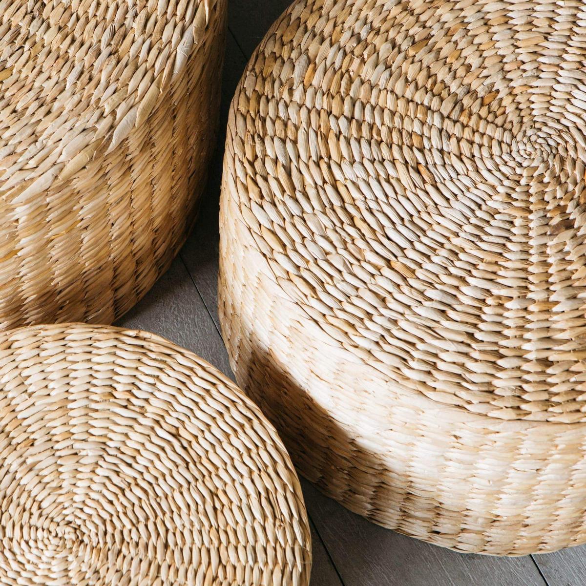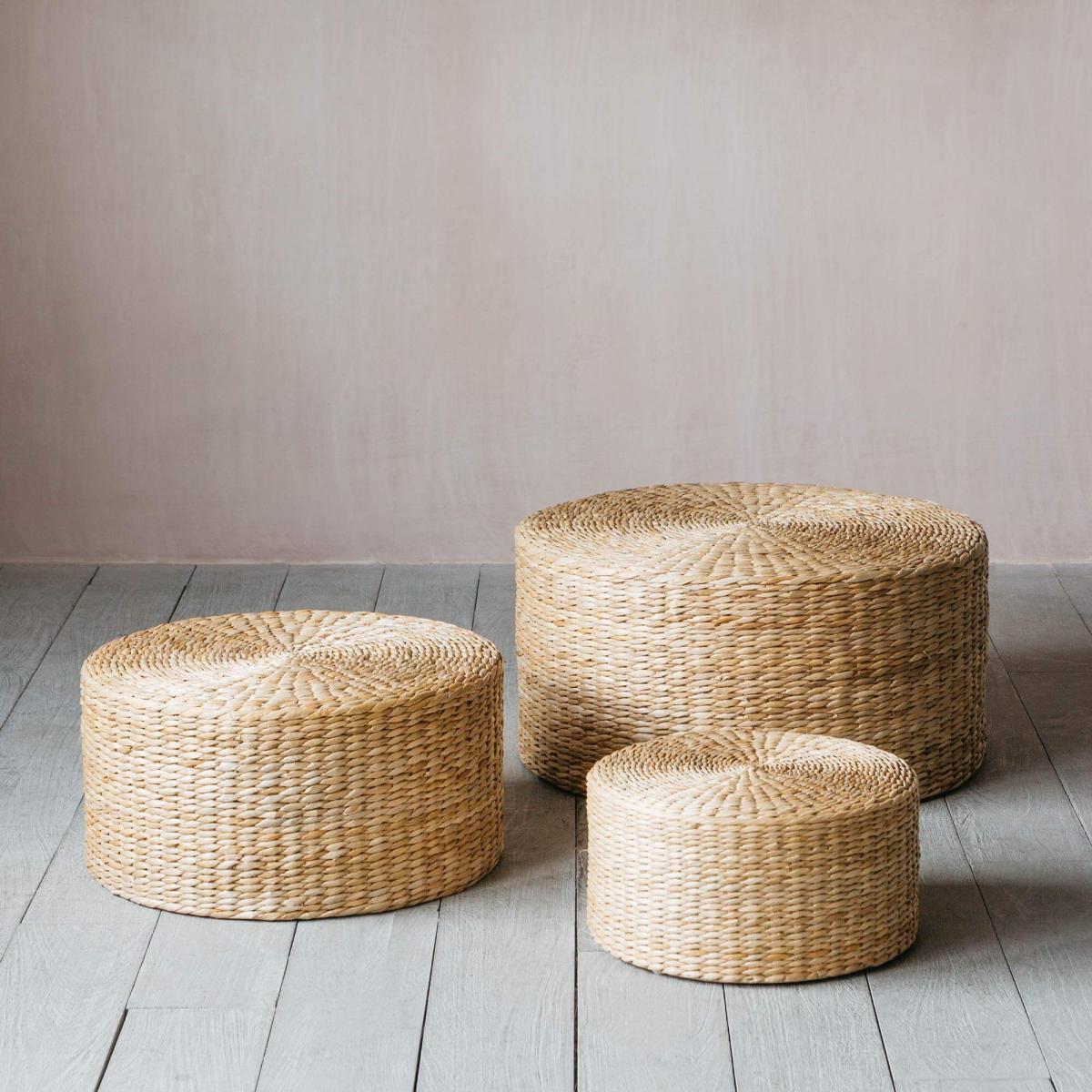Woven from rush grass on a wooden frame, this set of three circular pouffes double as both a bohemian seating option and unique side tables. Top with rustic rattan trays and unusual ceramics to create a sculptural display.