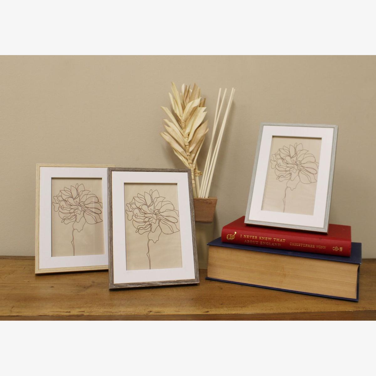 Set of three 6x4 photo frames featuring three different colourways. Grey, natural and brown. Can be displayed free-standing or wall hanging.