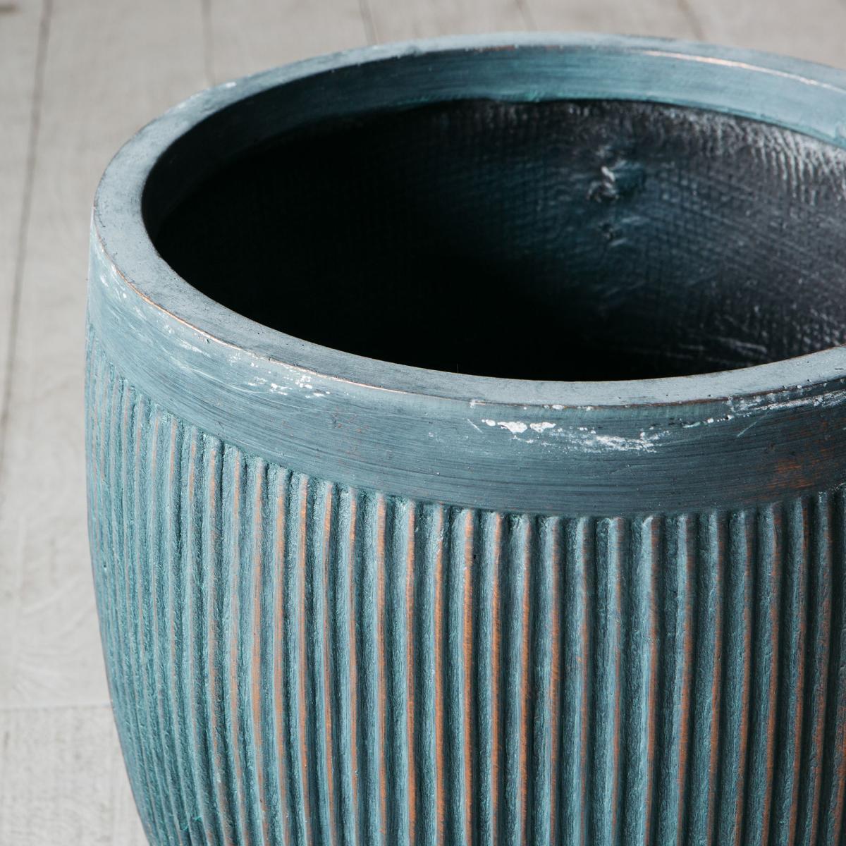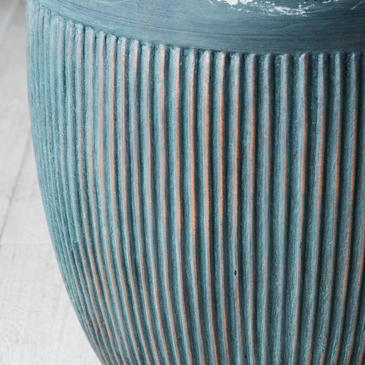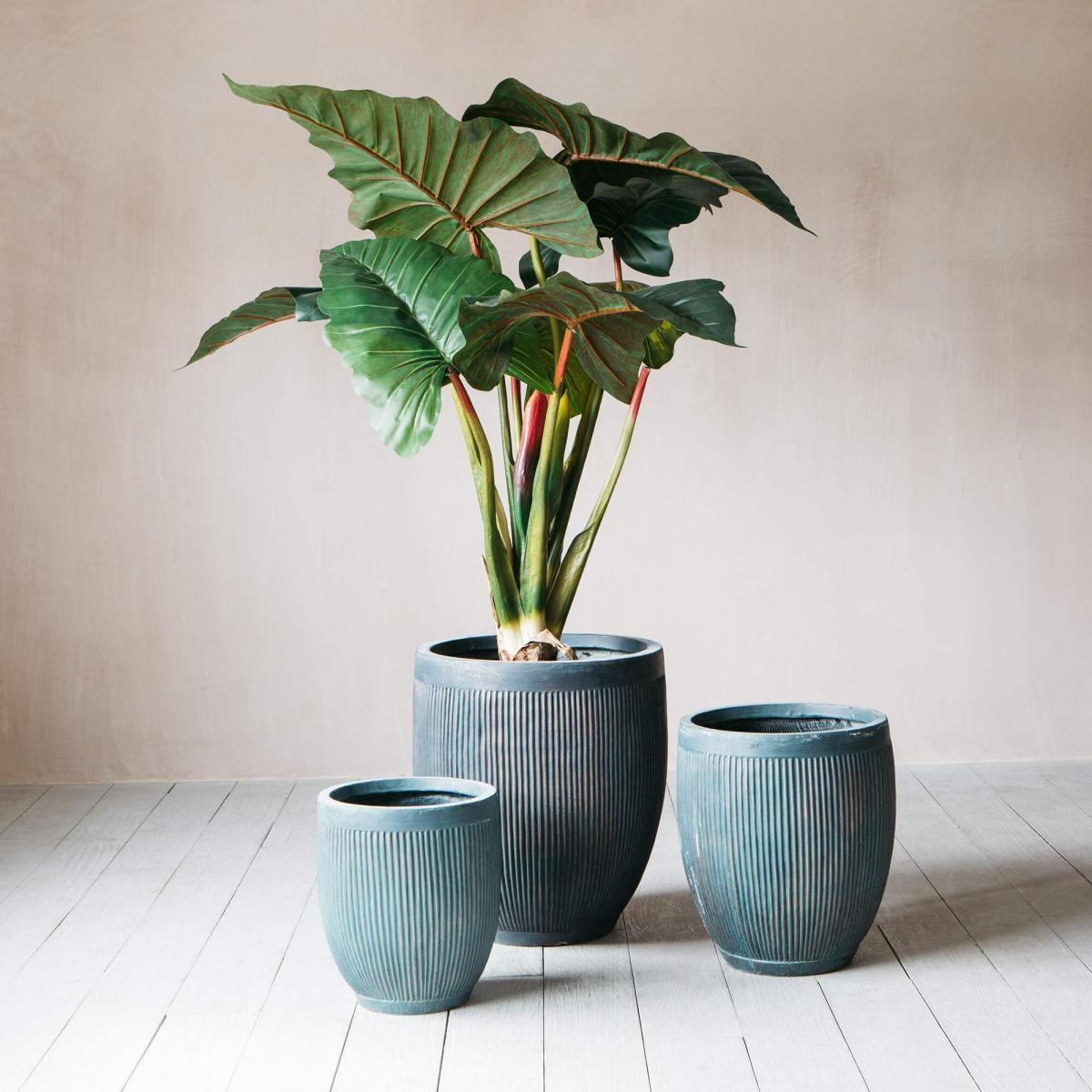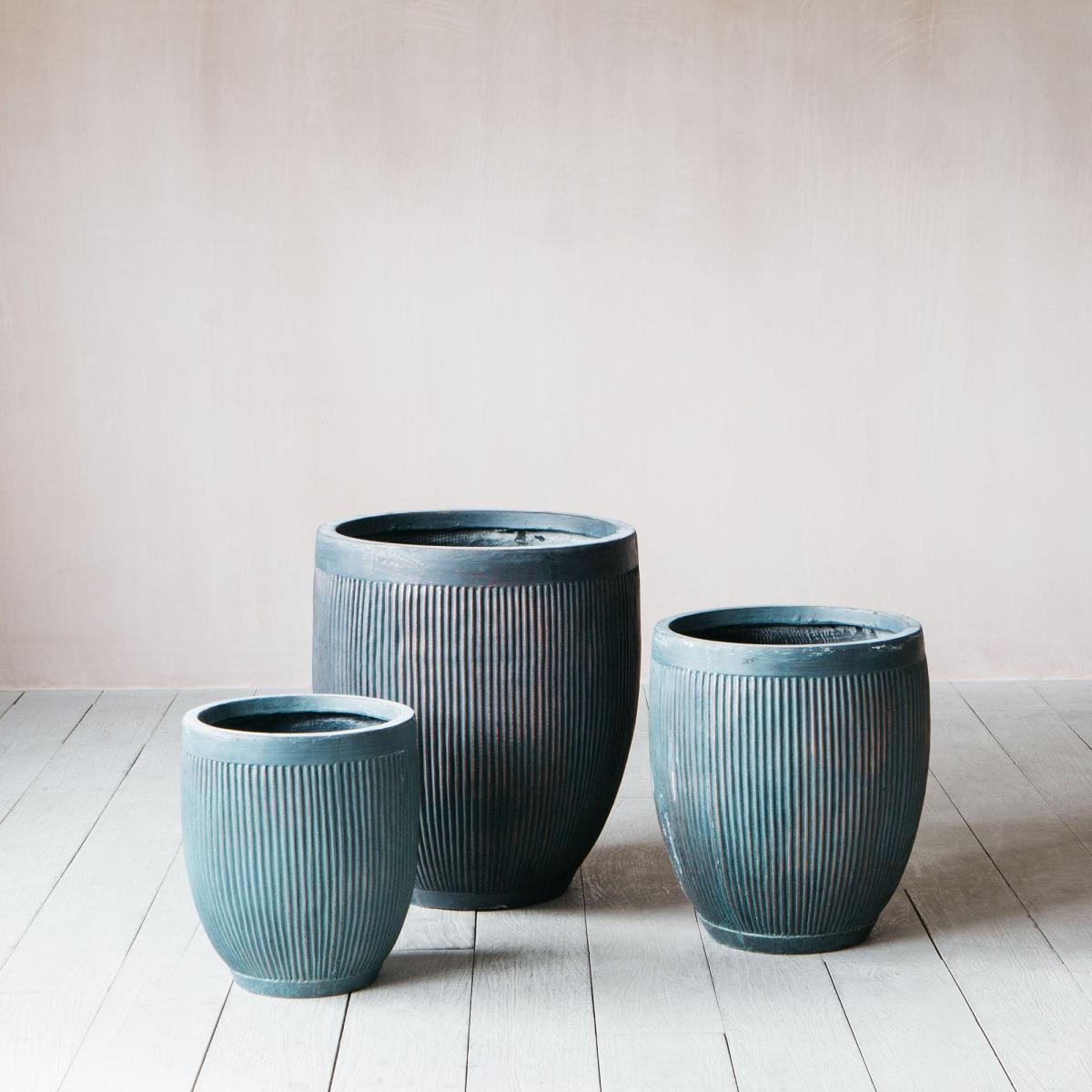 A set of three ribbed planters made of fibreglass with an antiqued finish. A stylish garden set to house your favourite small trees or a variety of fresh herbs.