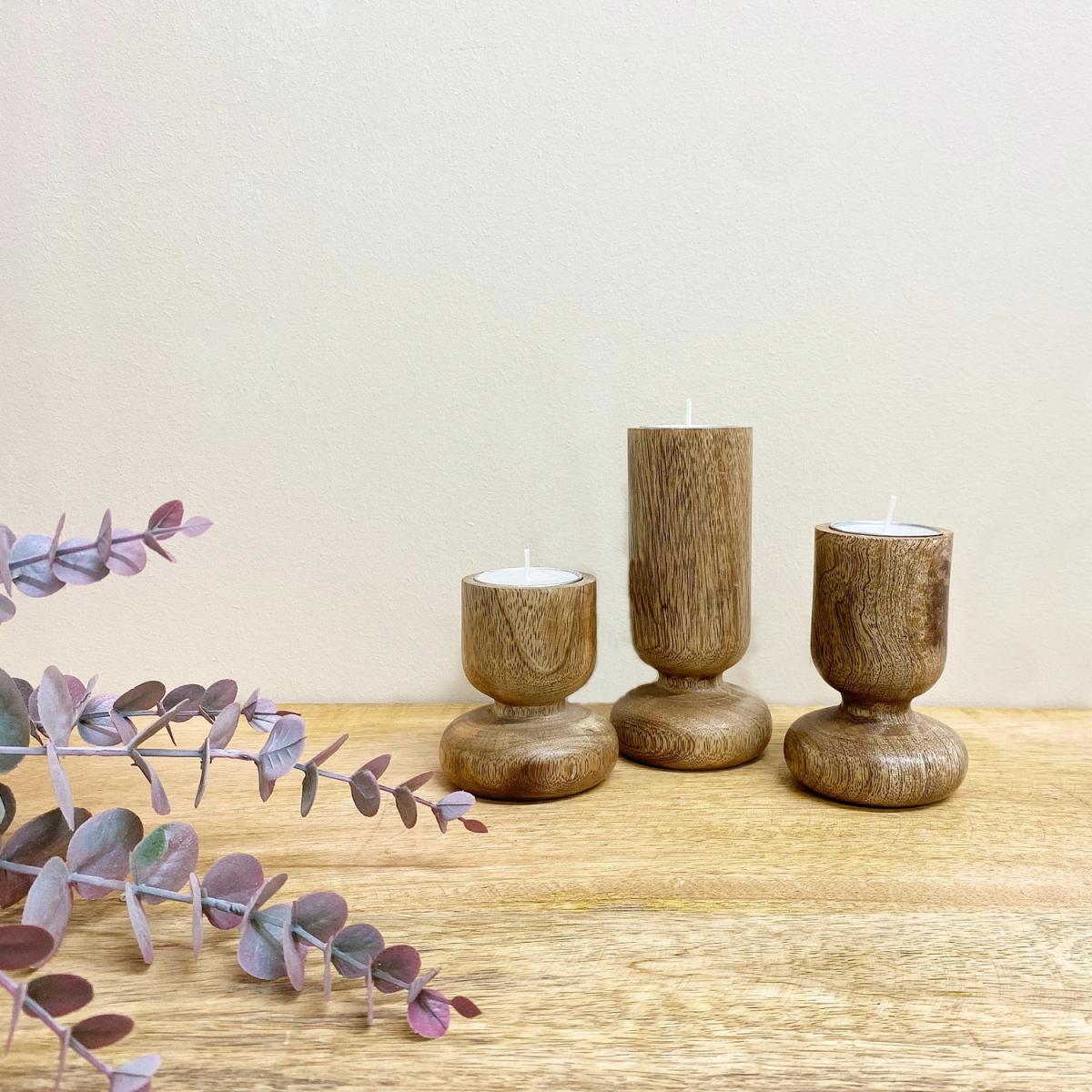 A set of 3 turned mango wood tealight holders (supplied). These items are beautifully crafted and have a smooth waxed finish. Dimensions small 6cm diameter 7.5cm high, medium 6cm diameter 9.5 high, large 6cm diameter 13cm high. All sizes are suitable for tealights or candles with a diameter of 3.5cm.
