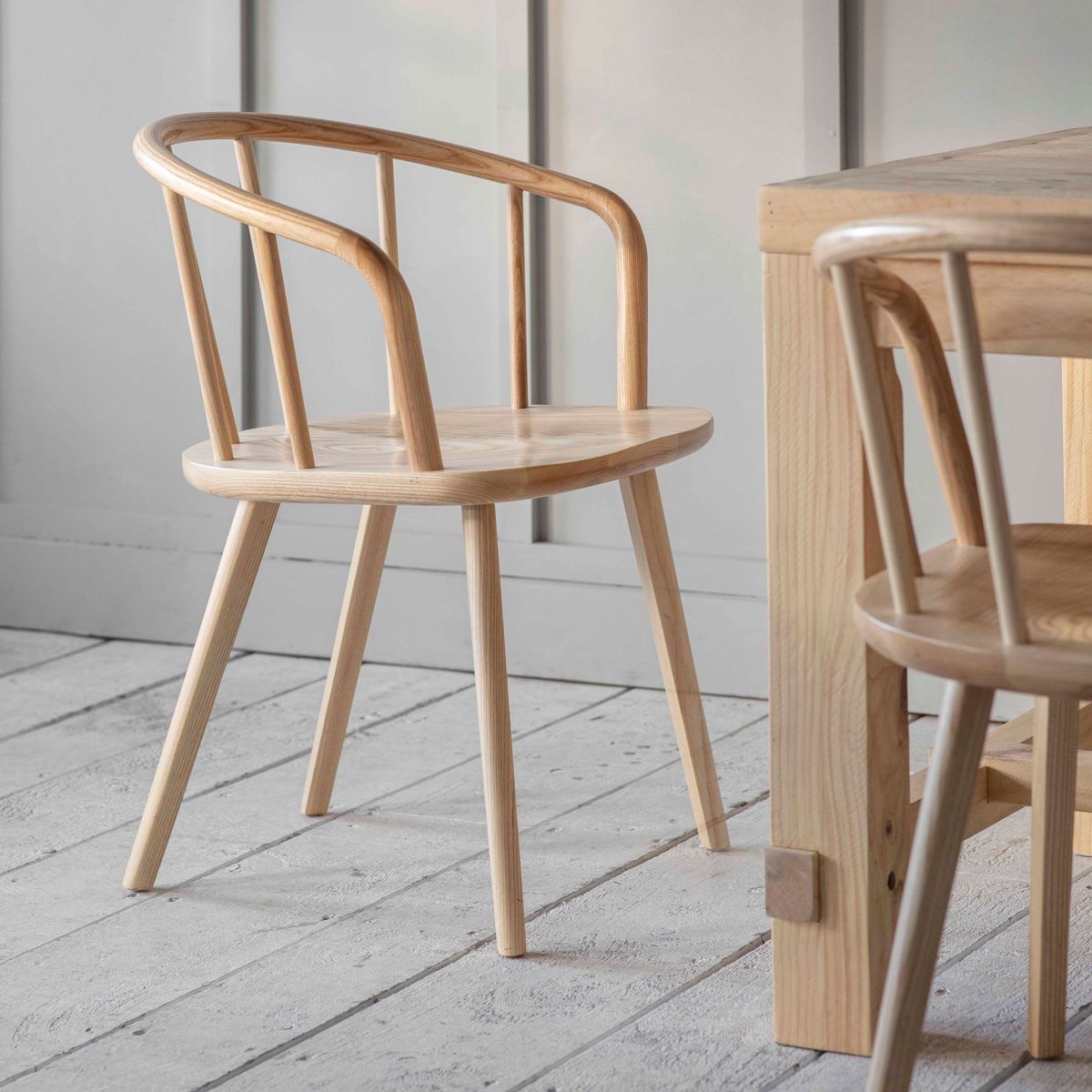 A set of two Carver chairs crafted from solid ask wood with a natural finish. Inspired by the traditional Windsor shape, but with a lower back and streamlined arms, these contemporary chairs offer support, comfort and style.