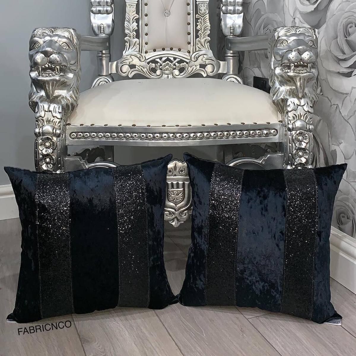 In this listing, you will find two of our gorgeous black crushed velvet cushions featuring two beautiful sparkly glitter panels. These are handmade in the UK and give off sparkles from every angle. Beautiful quality and real bespoke cushions.