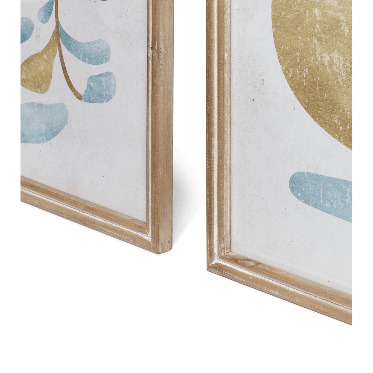This pair of prints brings a botanical touch, both in its abstract representation of plants, and in its nature-inspired muted blue and yellow colours. The rounded forms rebel against mundane symmetry, offering pleasing irregular shapes showcased in hand-painted wooden frames.