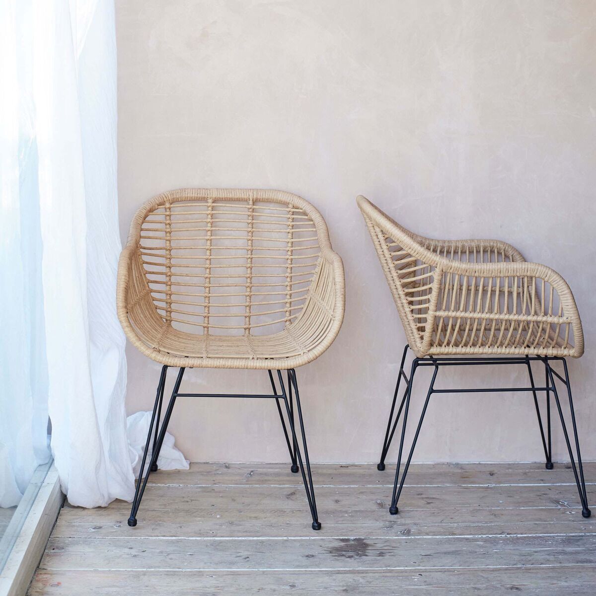 Extend the comfort on your home outdoors with our chic Hampstead rattan chairs. Crafted from plastic that's designed to look like bamboo, the wide-sweeping seat and arms make for a relaxing recline. Natural open style weave combined with the powder-coated steel hairpin legs encompasses Scandinavian trends. This blend of materials enhances the versatility of this piece, making it ideal for both indoor and outdoor lounging.