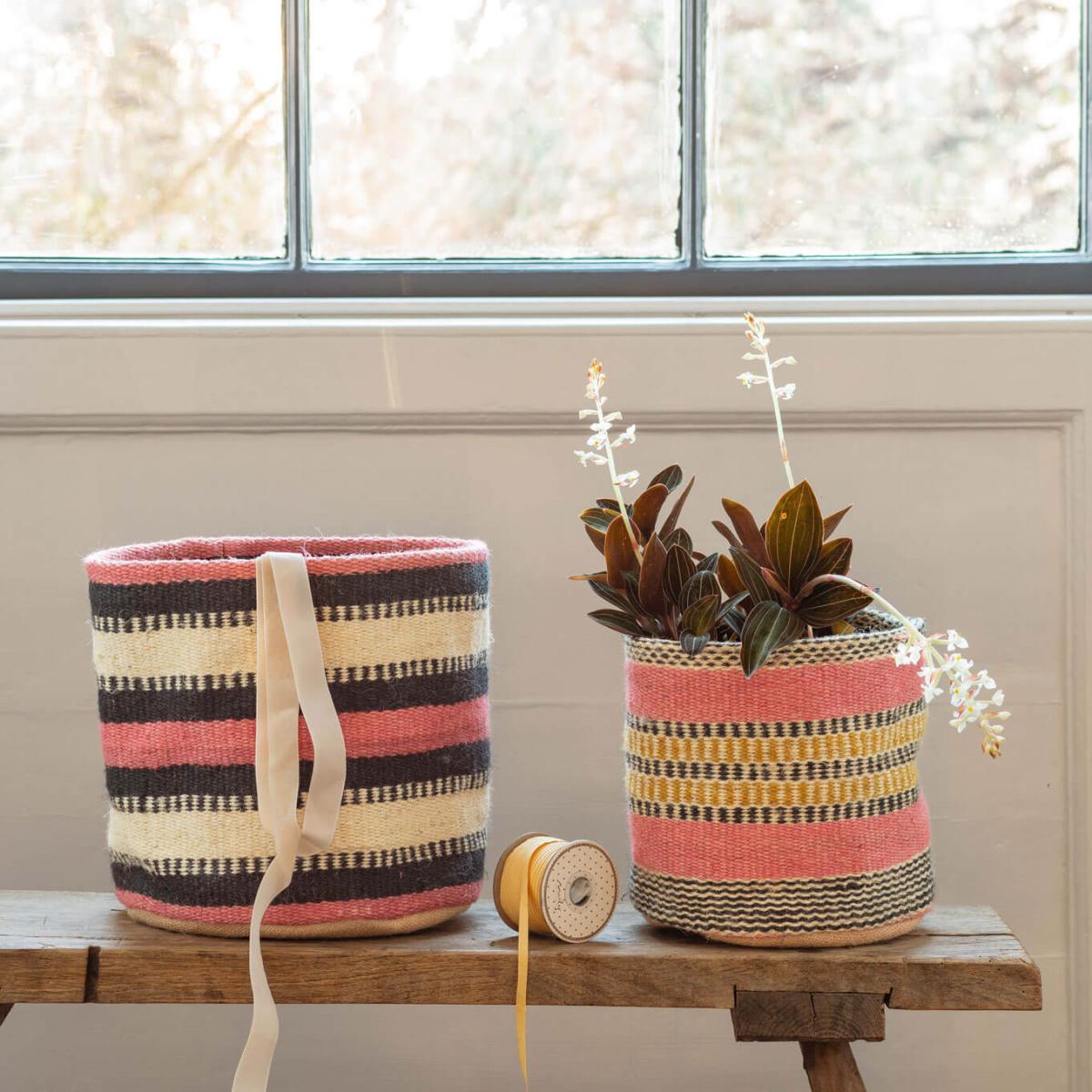 Handcrafted from woven jute, these set of two jute bins will add a cheerful pop of colour to your living space. Handy storage for around the home to keep small bits and bobs safe and together or as stylish covers for plant pots. Available in three bold colour combinations. Large bin: H25 x Diameter 25cm. Small bin: H20 x Diameter 25cm. Handmade from woven jute with a cotton lining. Sold as a set of two.