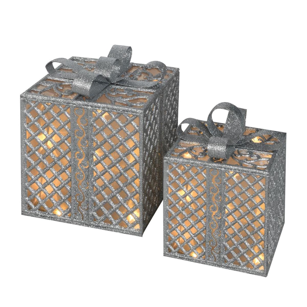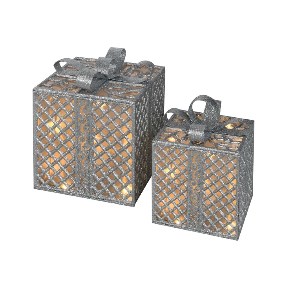 This Set of Two LED Silver Presents are a wonderful way to decorate your home this Christmas. With two different sizes included, both with a glitter-covered surface that will shimmer beautifully in the light. These trendy decorations will look lovely placed near a tree or in a hallway.