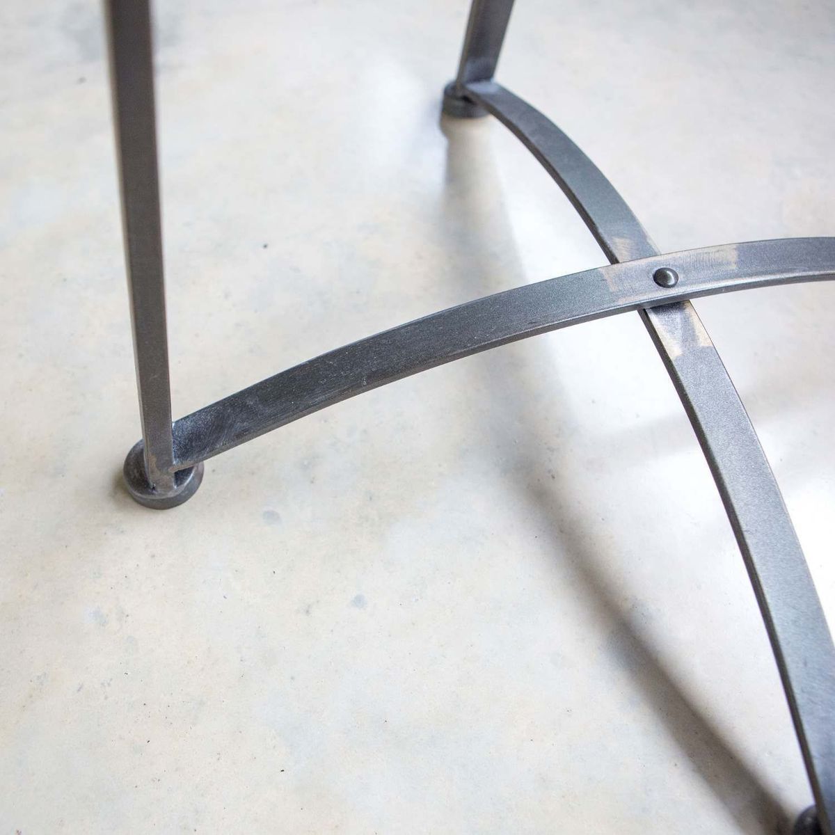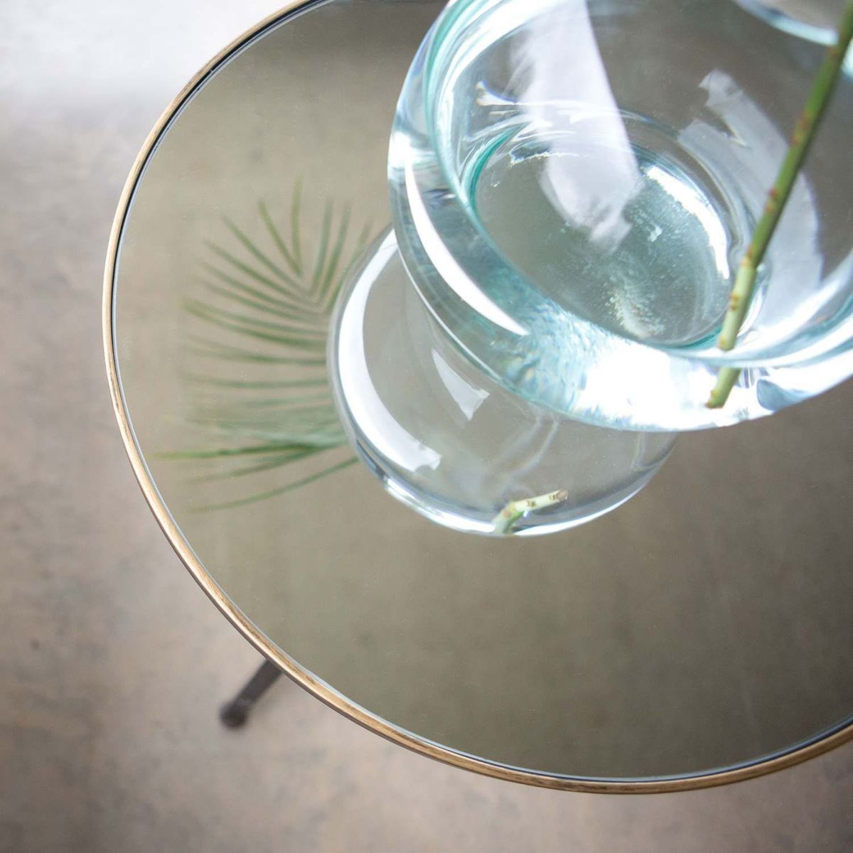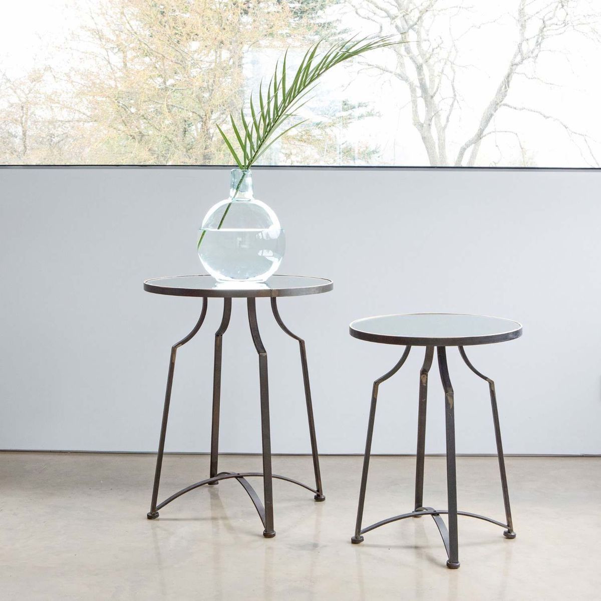 A contemporary addition to any living space, this set of two side tables feature sleek iron frames with a distressed black finish, producing a much-loved aged appearance. Complete with circular mirrored glass tabletops, this set can be paired together or used separately throughout your interior.