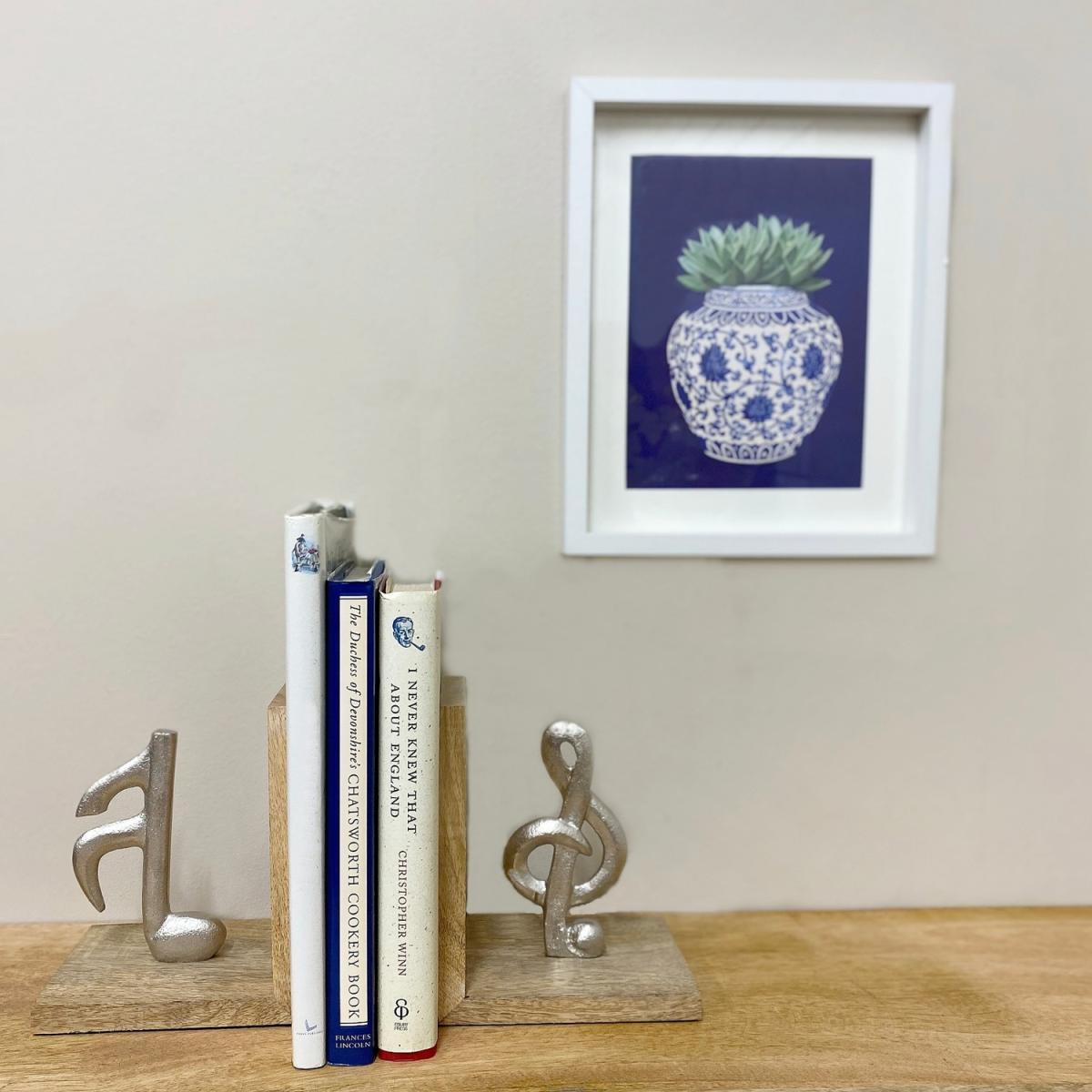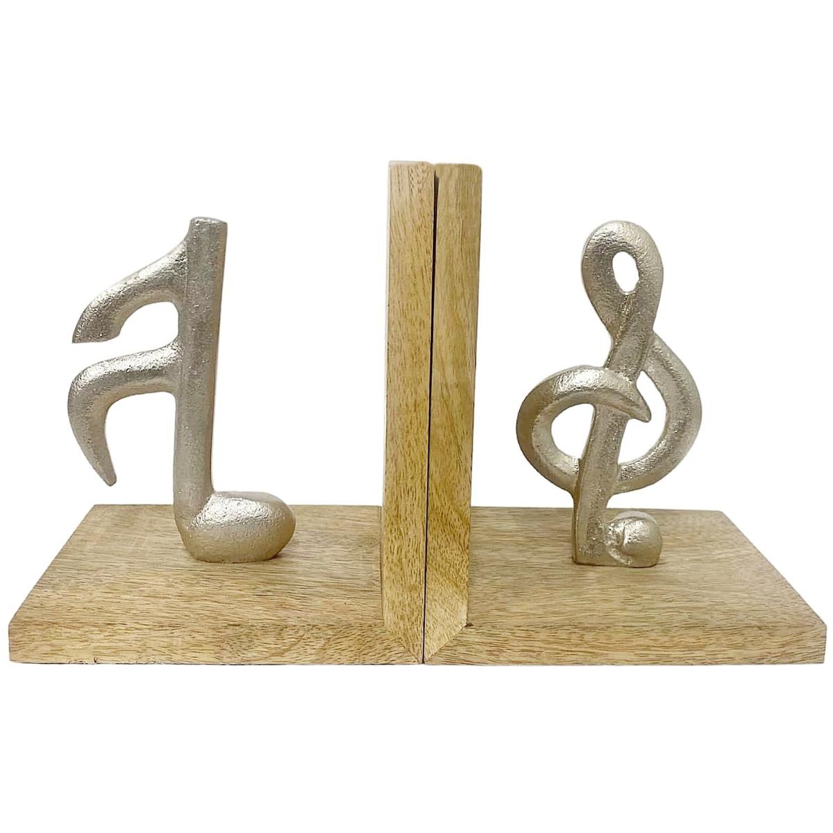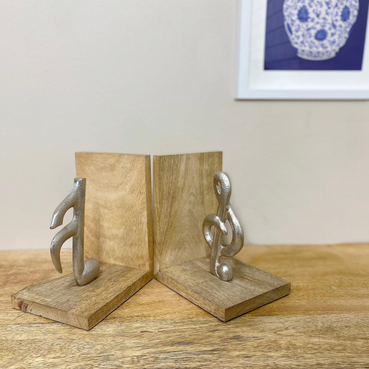 A crafted pair of wooden bookends featuring 2 musical notes in aluminium, Treble Clef and a Semiquaver. These stylish bookends have a felt base to protect your furniture. A perfect gift for any keen musician and will look beautiful on a mantelpiece or bookcase.