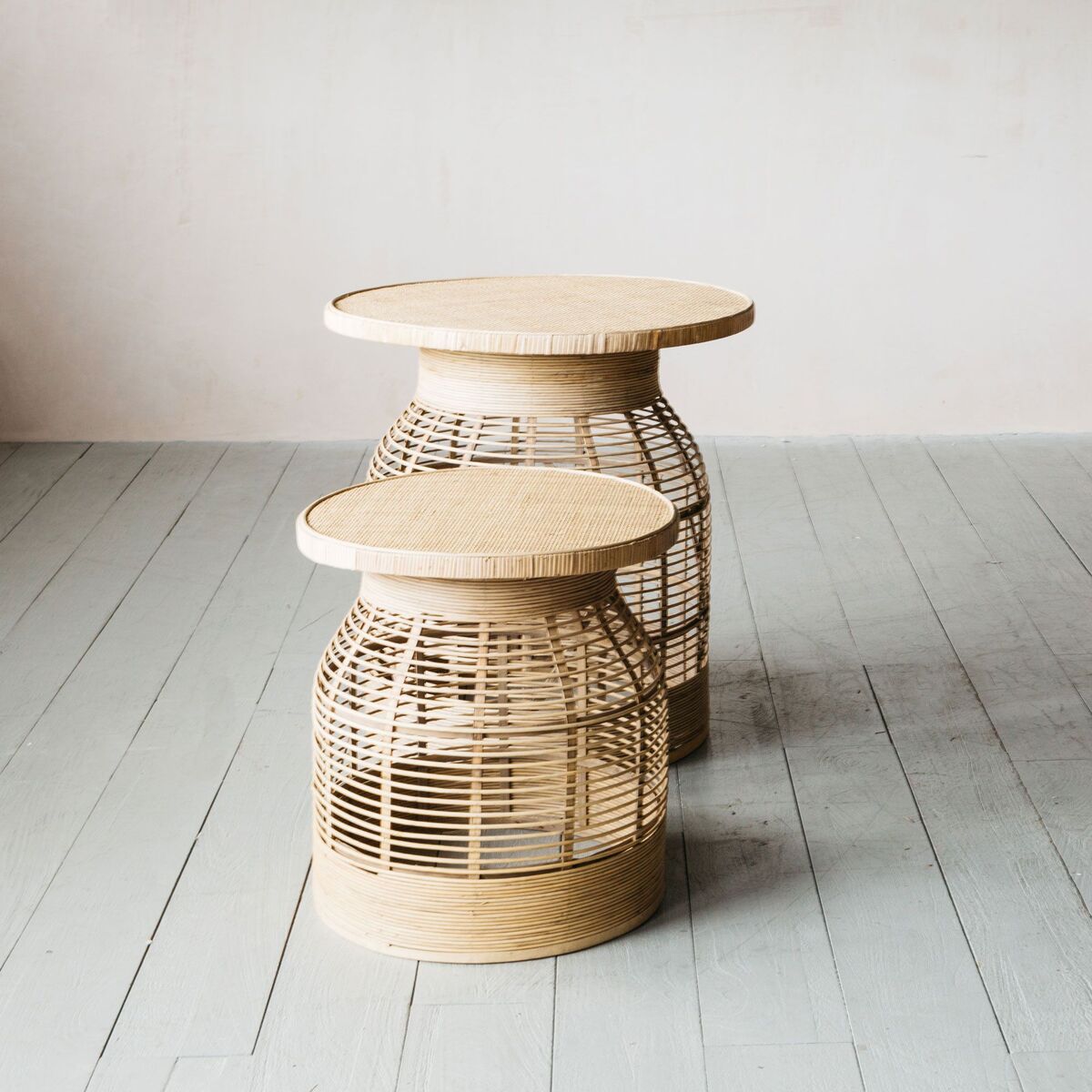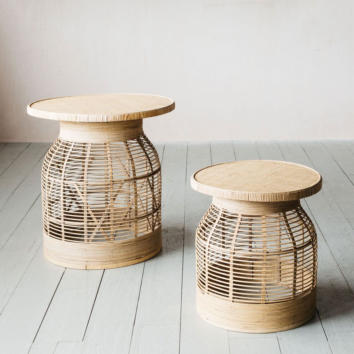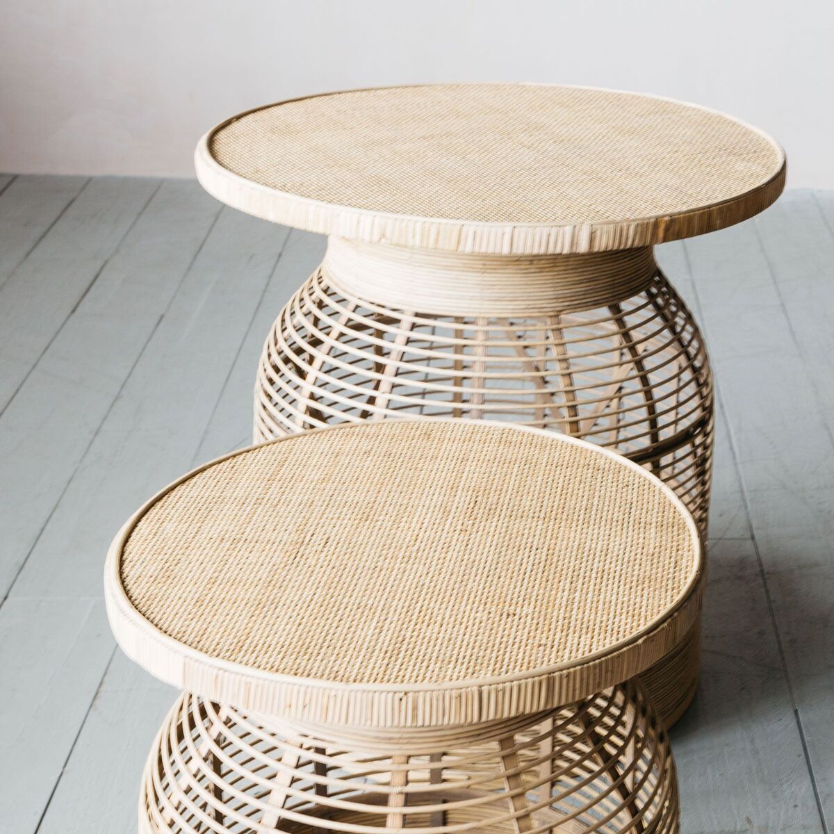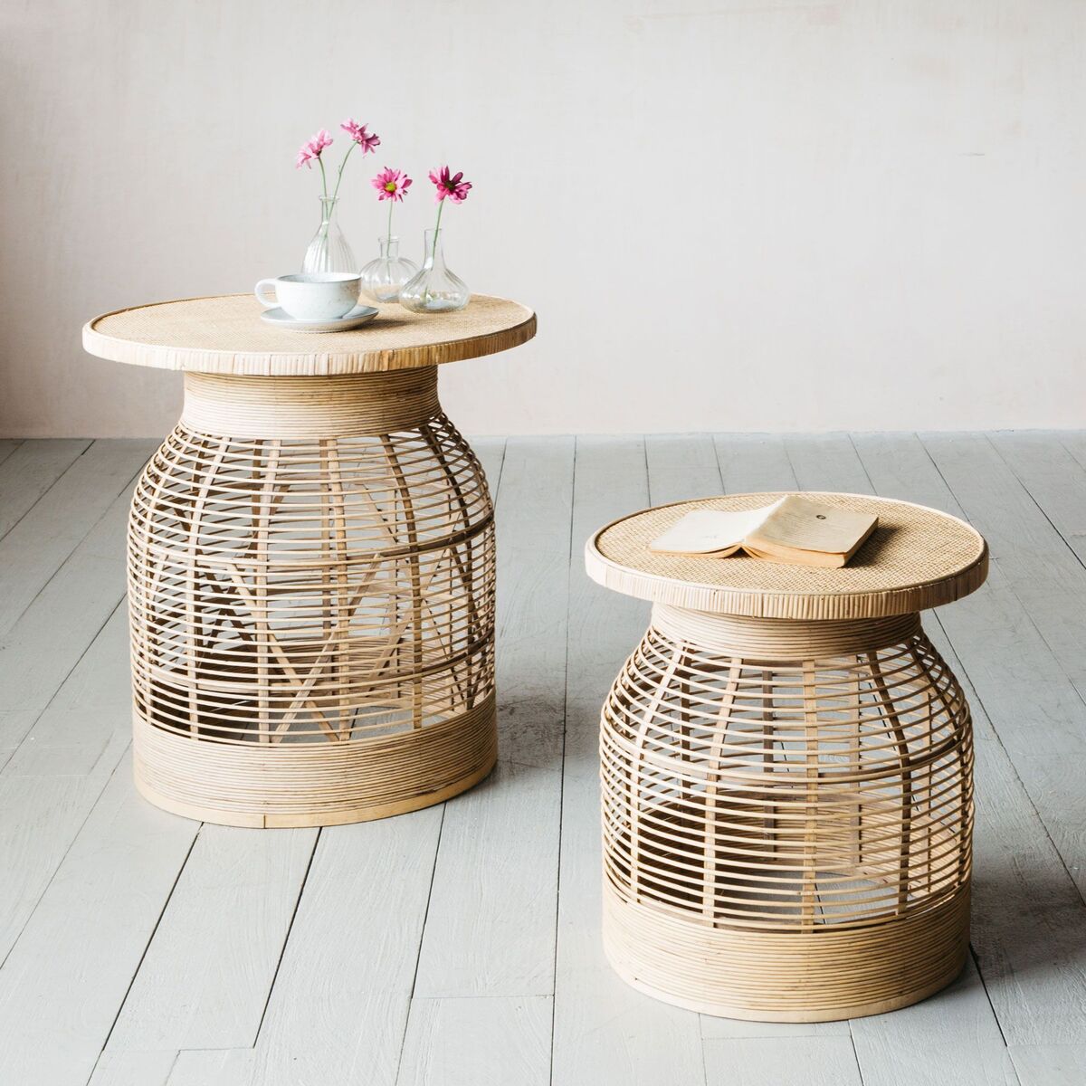 A set of two round side tables crafted from sustainable bamboo with a woven rattan top. The perfect addition to a bohemian-inspired space.