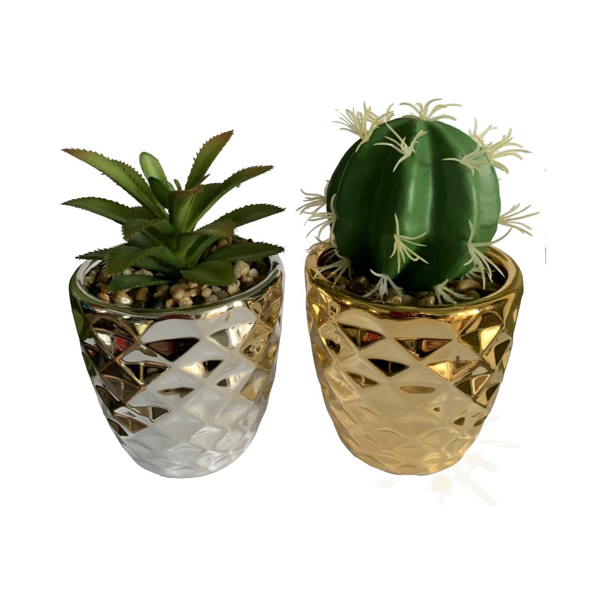 Set of Two Silver and Gold Ceramic Planters Artificial Cactus and Dracaena - Green