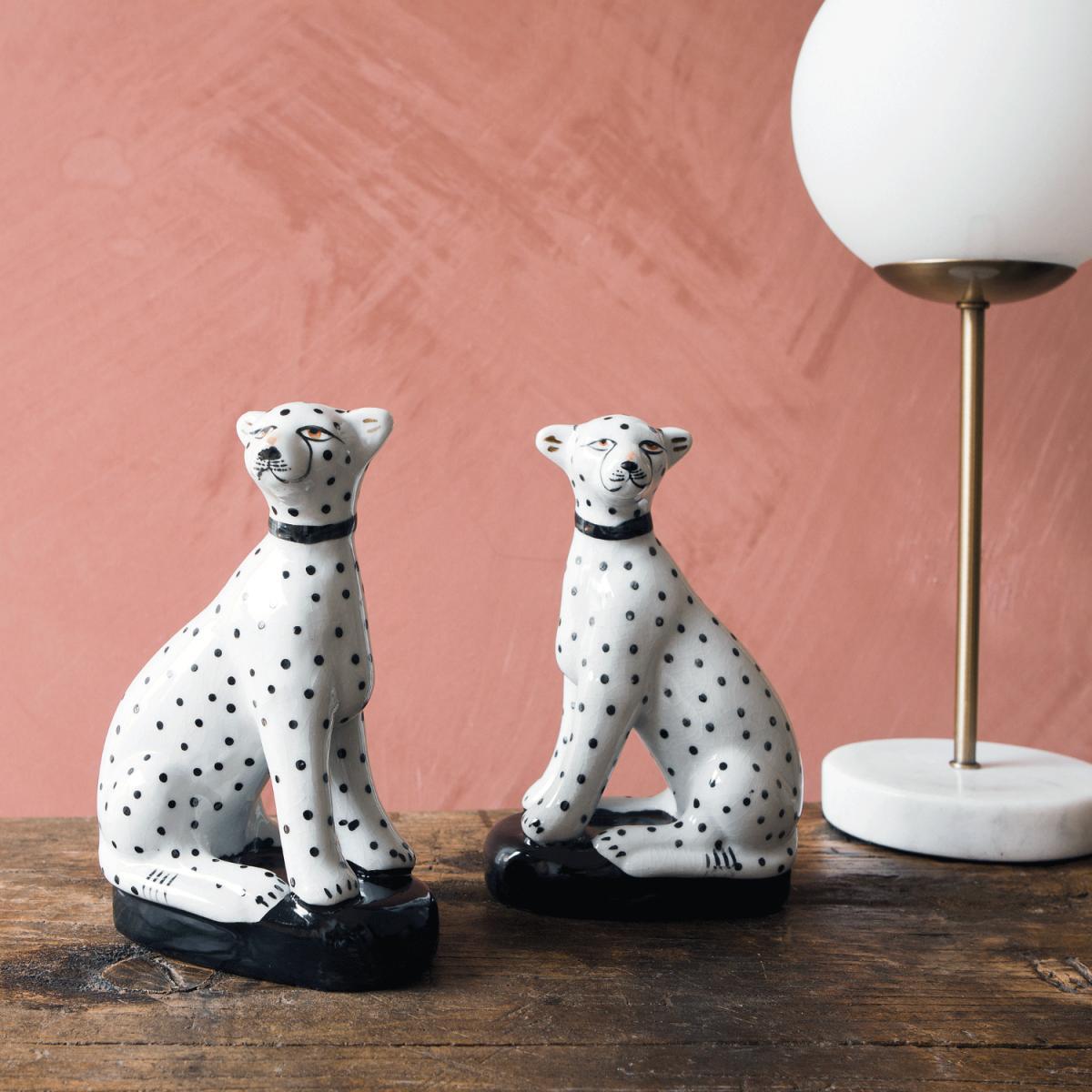 These sitting leopards make a charming statement piece that adds personality to both modern and traditional interiors. I love how their playful yet sophisticated design can create a striking focal point on a mantel, console, or bookshelf. They work particularly well in eclectic or mid-century schemes, especially when paired with simple, understated surroundings to let their character shine. Practical styling tips would be to position them alongside greenery or complementary colours for contrast, and avoid overcrowding to ensure they stand out. They’re versatile enough to work in living rooms, studies, or even bedrooms, adding a touch of whimsy without overpowering the space.