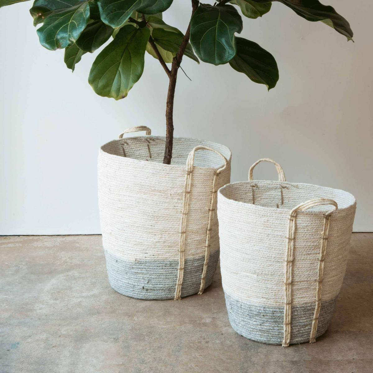 I love these baskets because of their clean, neutral tones and versatile design, making them a practical yet stylish addition to many interiors. They work particularly well in contemporary, Scandi, or coastal schemes where their understated grey and white colour palette can complement natural textures and soft colour schemes. Use them for organising anything from blankets and magazines in the living room to plants or towels in the bathroom. Their generous height and sturdy handles also make them great for easily transporting items or adding height and visual interest to a corner. A simple styling tip is to pair them with matching or complementary baskets in smaller sizes for a cohesive, layered look.