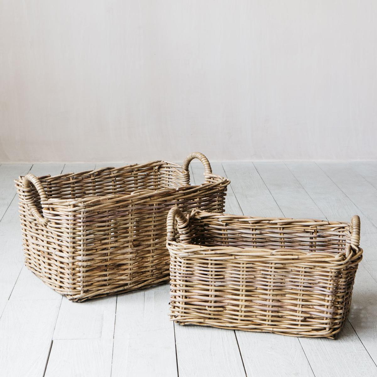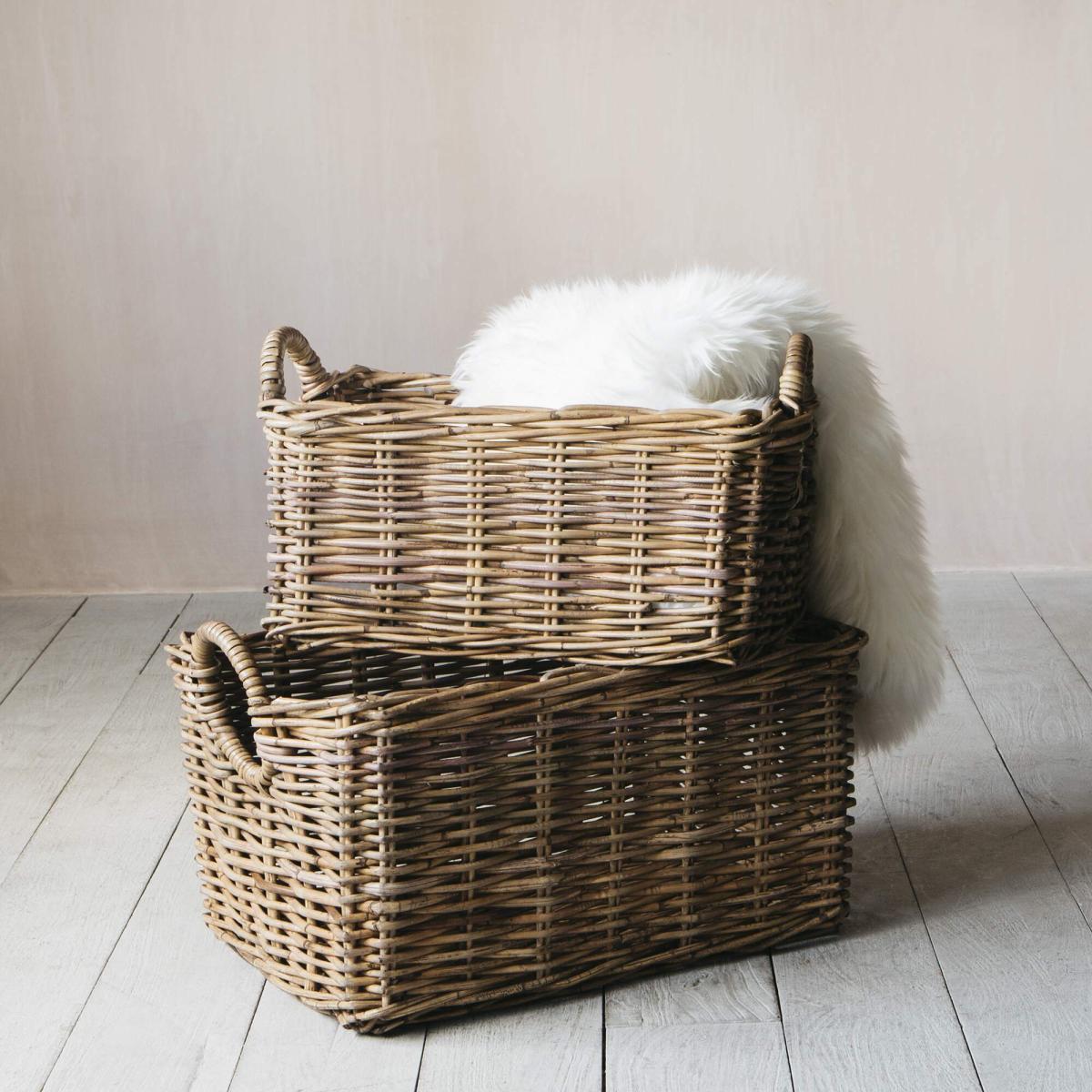 A set of two baskets handwoven from natural wicker, a stylish storage solution for the rustic-inspired home. Store blankets, toys or shoes inside and tuck away for a tidy home.