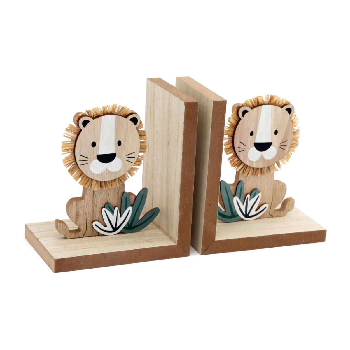 A set of two wooden bookends each with a cartoon style lion figure sat among grass effect. Each wooden bookend has a base including a lion figure. The lions are natural wood with black and white detail plus raffia mane, These cute bookends would be a useful and charming addition to any child's bedroom or nursery.