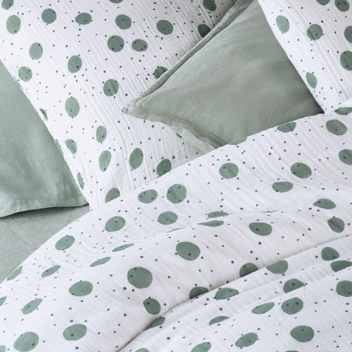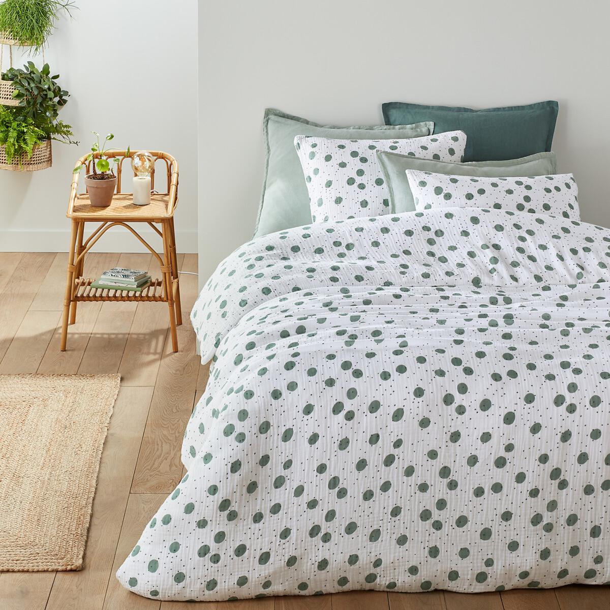 The soft and pretty Sevilla bedding set shows off playful polka dots in a range of sizes. Very soft to the touch and naturally wrinkled, cotton gauze is resistant and softens over time. Easy to care for, ironing is not required. Product Details. 100% cotton. Straight buttoned hem. Front / back print Shop the Sevilla collection online at La Redoute.. Over the seasons, bring your personal touch by mixing the Sevilla range with our range of Snow plain bedding. Care Advice. Machine washable at 60°C Size. 140 x 200 cm : Single. 200 x 200 cm : EU Double. 240 x 220 cm : Double. 260 x 240 cm : King Additional Information. This product labelled STANDARD 100 by OEKO-TEX® - certificate no. CQ 1102/4 IFTH follows a certified and controlled manufacturing process which is respectful of your skin. The STANDARD 100 by OEKO-TEX® is the first label that meets the needs of consumers in terms of human ecology. It guarantees the absence of harmful substances or those potentially presenting a risk to health.