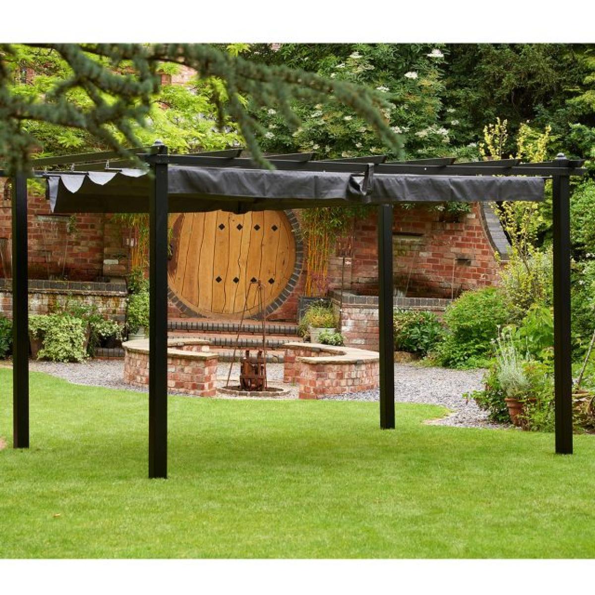 Made from sturdy aluminium, this Seville Pergola Gazebo 3m x 3m features a retractable canopy that can be drawn back to let in the sun when required. The permanent nature of this structure makes it a striking garden feature and perfect for providing cover over furniture. Black powder coated frame. Non machine washable - To clean, use hot soapy water.  Simple assembly. Dimensions: H 260 x W 300 x D 300 cm Weight: 30kg All screens vary in colour reproduction and whilst every effort has been made to display the colour as accurately as possible it is for guidance only.