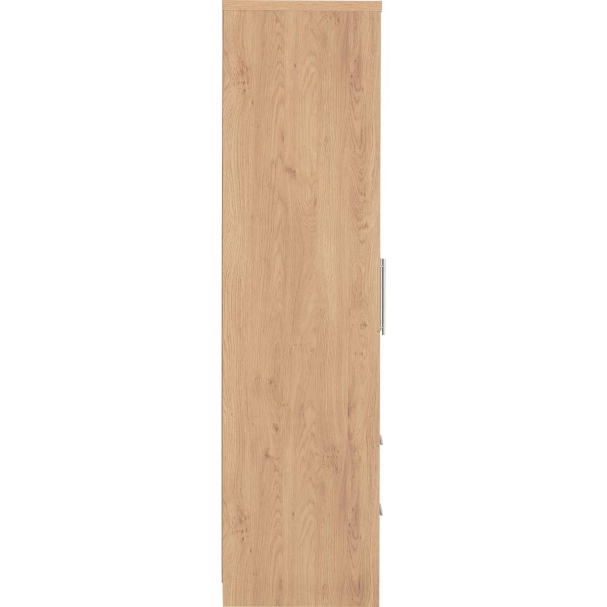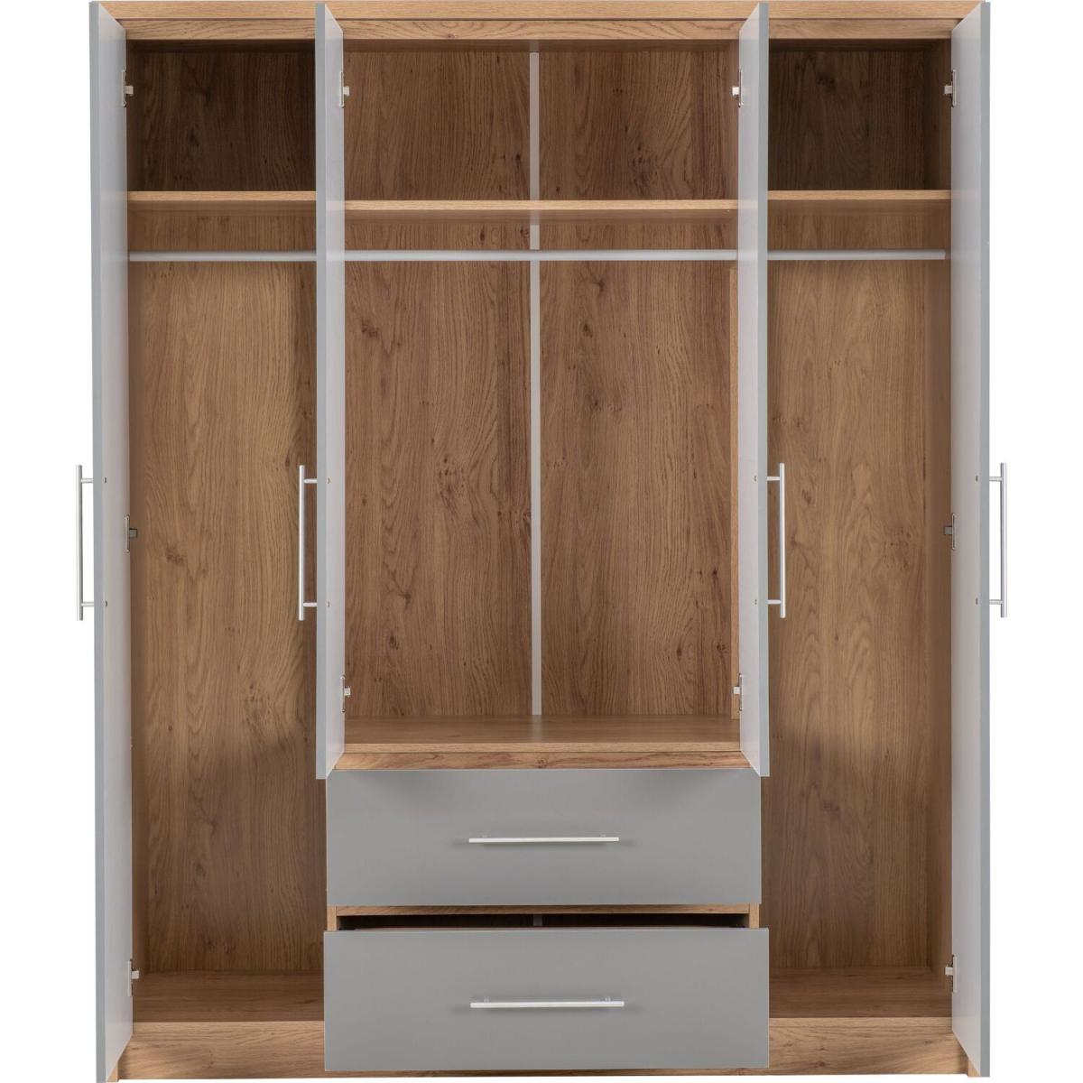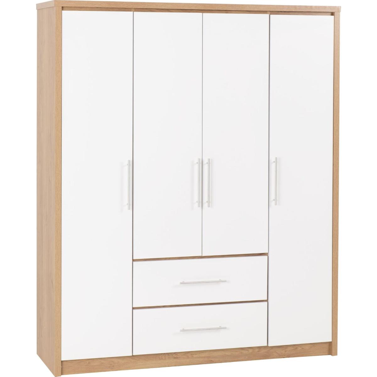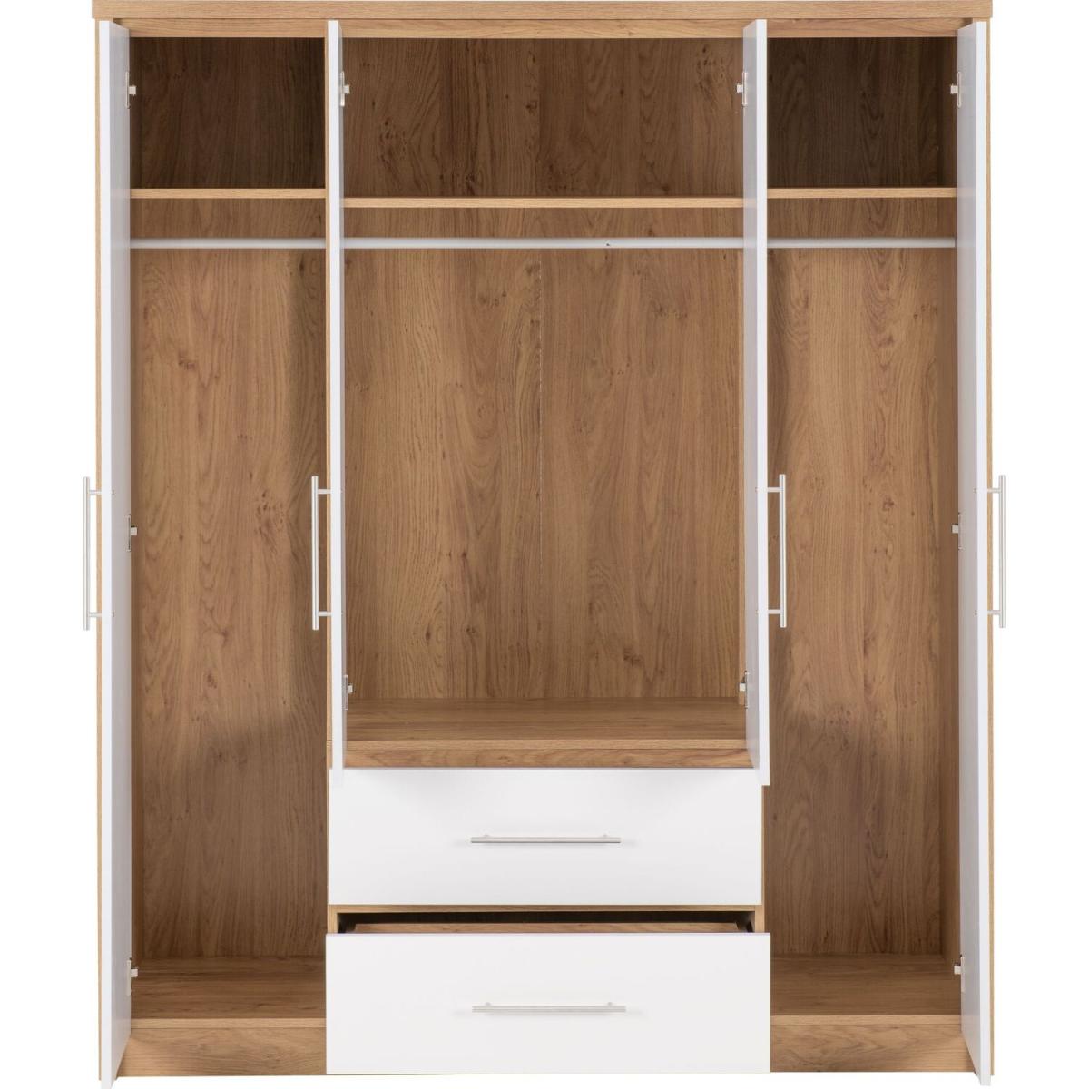 I love the Seville wardrobe for its crisp white doors framed in oak-effect - it sits equally well in Scandi, coastal or contemporary schemes. Four doors plus two deep drawers and adjustable shelving mean you can tailor the interior for folded clothes, storage boxes or bedding. For styling, keep the top clear with a single low plant, a woven basket or small framed print, then echo the handle finish in nearby hooks or drawer knobs to tie the room together.