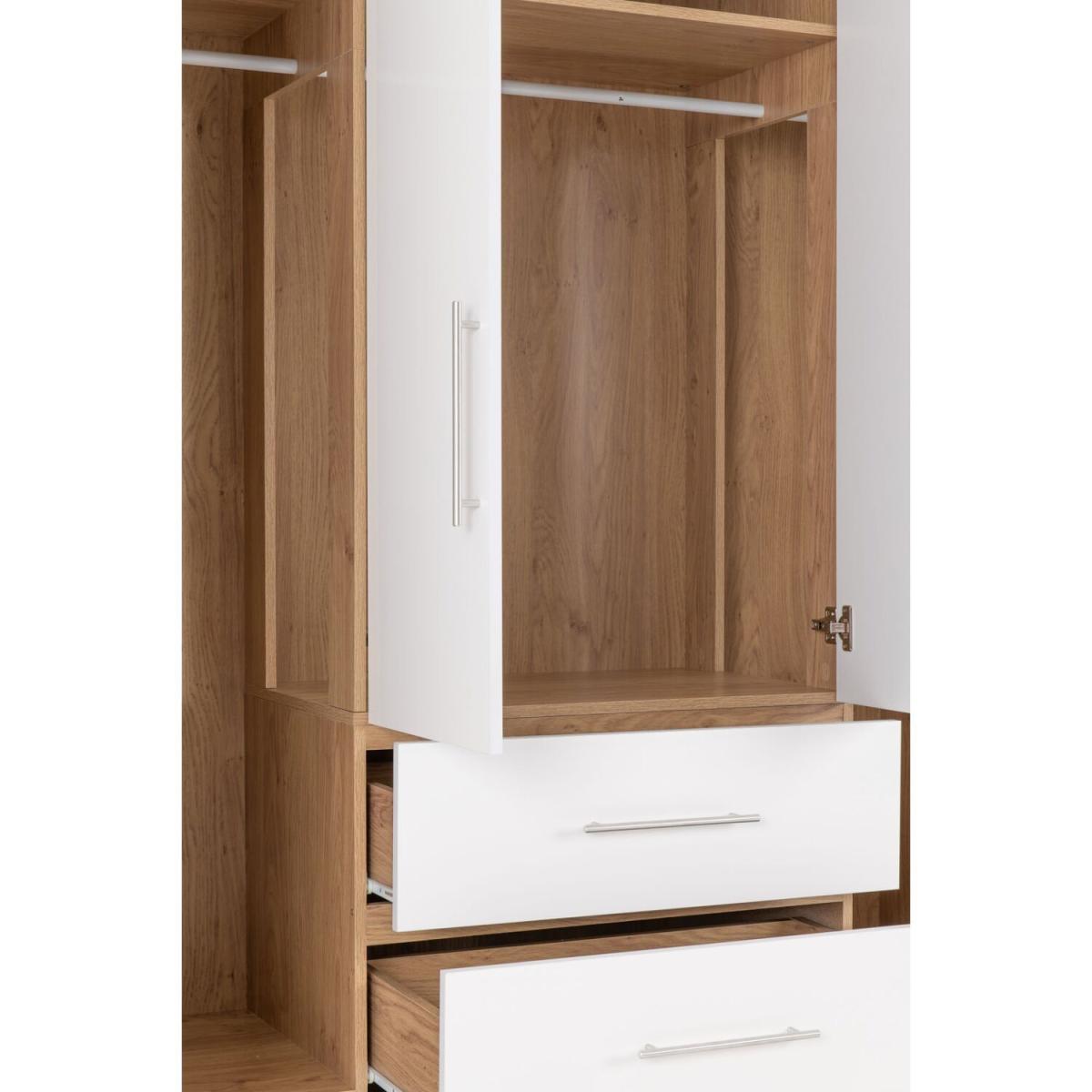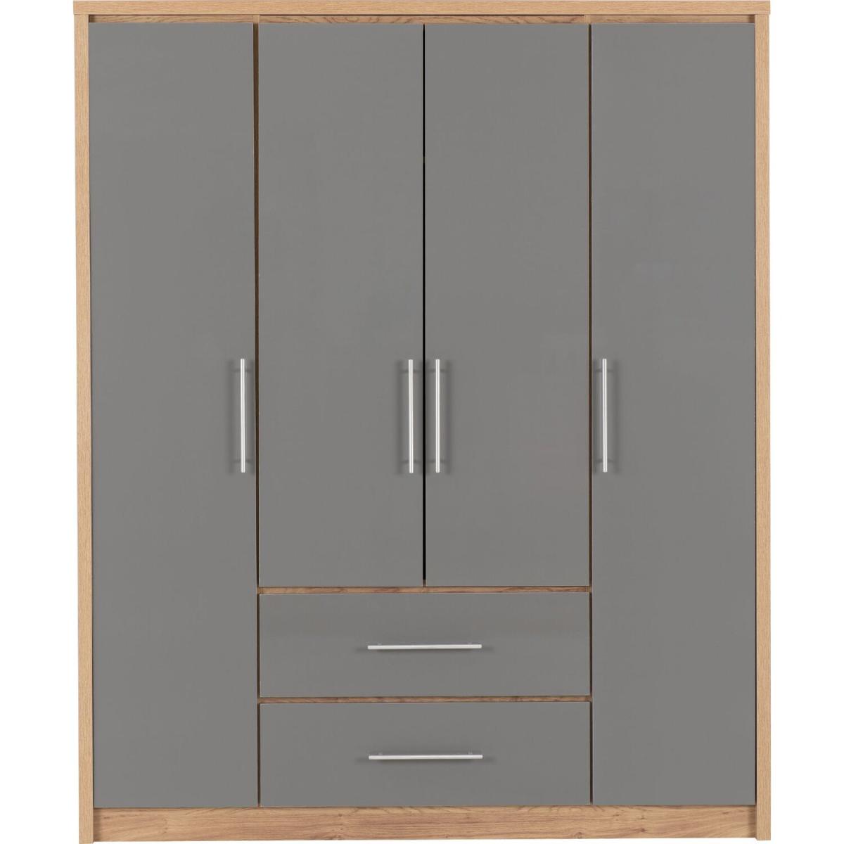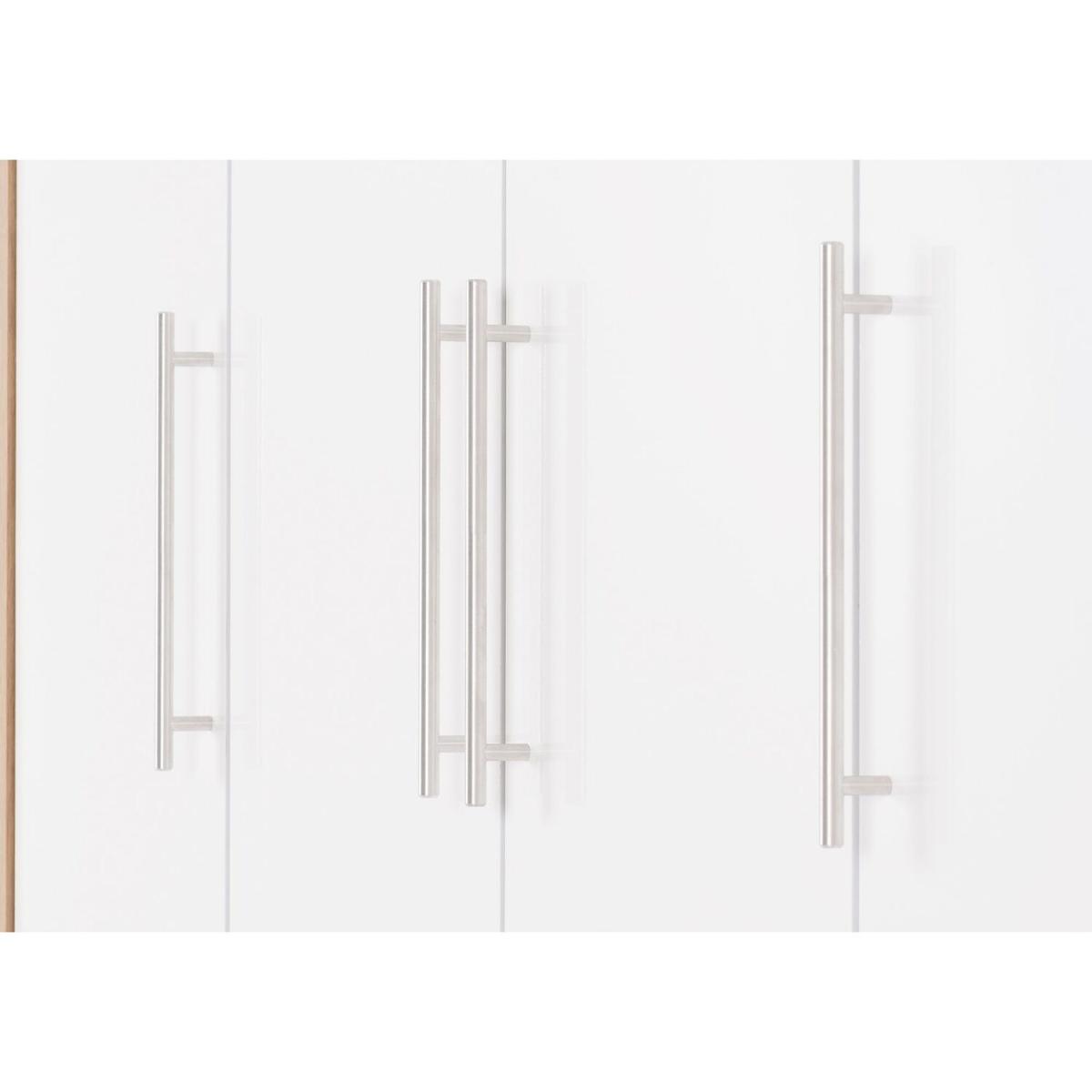 I love the Seville wardrobe for its crisp white doors framed in oak-effect - it sits equally well in Scandi, coastal or contemporary schemes. Four doors plus two deep drawers and adjustable shelving mean you can tailor the interior for folded clothes, storage boxes or bedding. For styling, keep the top clear with a single low plant, a woven basket or small framed print, then echo the handle finish in nearby hooks or drawer knobs to tie the room together.