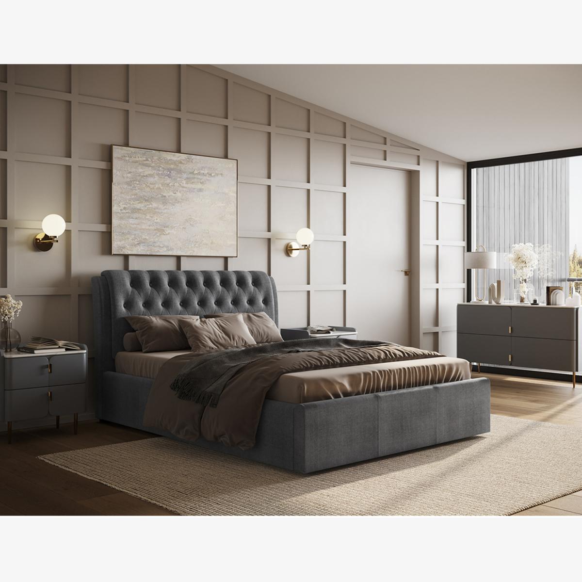 Our Seville ottoman consists of a very minimalistic and elegant styling. Seamlessly upholstered in an extremely sought after light grey linen fabric. The deeply padded cushioned headboard is detailed with a stunning buttoned design. With a sprung slatted base to relieve the stress on your mattress. The gas lift ottoman reveals a vast storage space for bedding and other accessories.