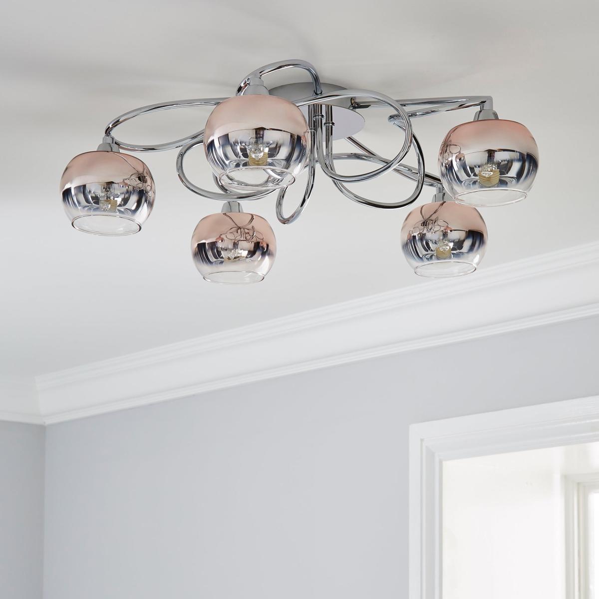 Featuring five ombre glass bauble shades designed with delicate clear glass droplets, the Seychelles ceiling fitting would make a glamorous addition to any room. This beautifuly crafted fitting is made with a beautiful woven arm frame with a sleek chrome effect finish, and available with a choice of shade colour options.