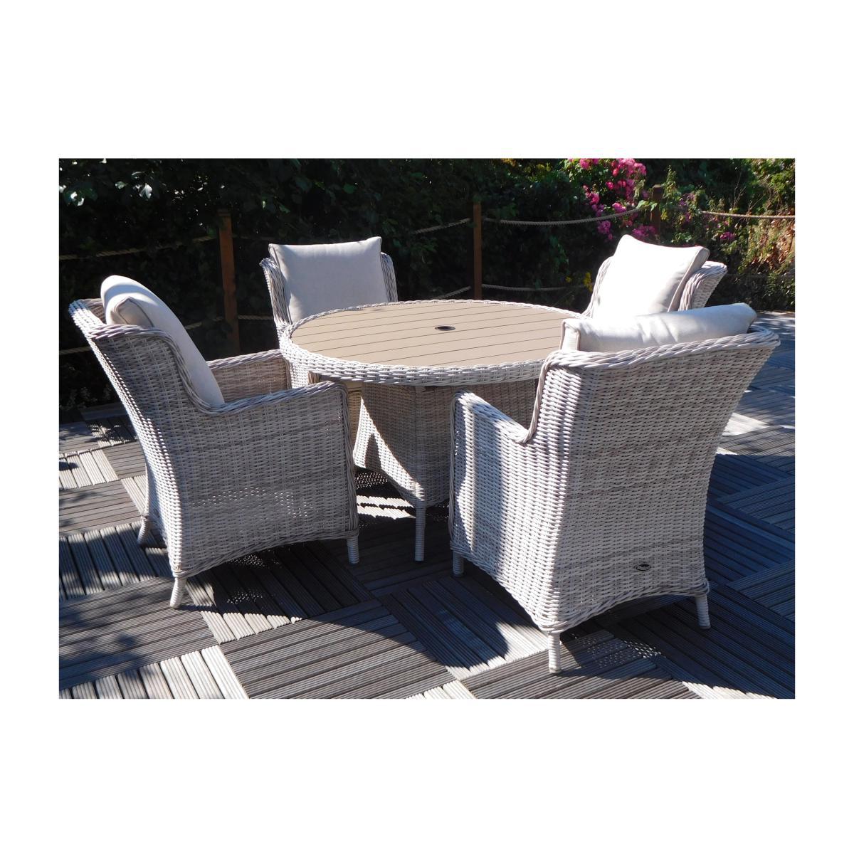 The Seychelles 4 Seater Polywood Comfort Dining Set is perfect for any garden and with it's modern rattan design is sure to complement any outdoor space. The set features 4 Comfort chairs and a 120cm dining table, complete with an attractive polywood tabletop. Designed to stand up to the elements, this set is as practical as it is comfortable featuring stain proof and water-resistant cushions, making it perfect for use all year round. Please note, unfortunately we cannot deliver this item to the Channel Islands.