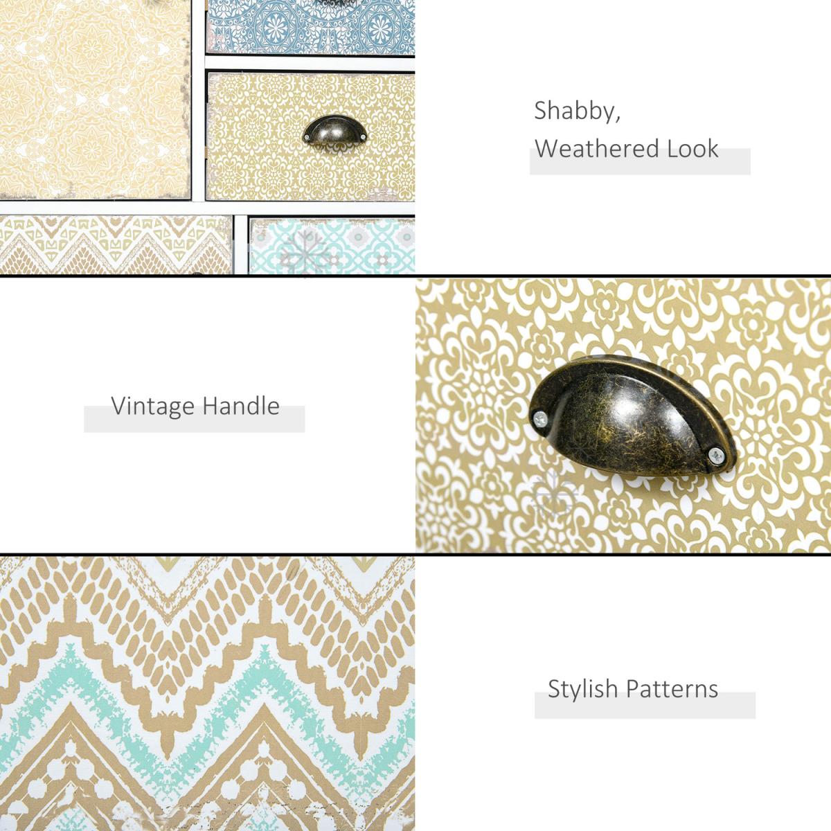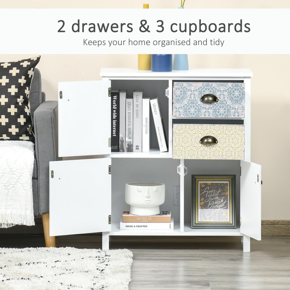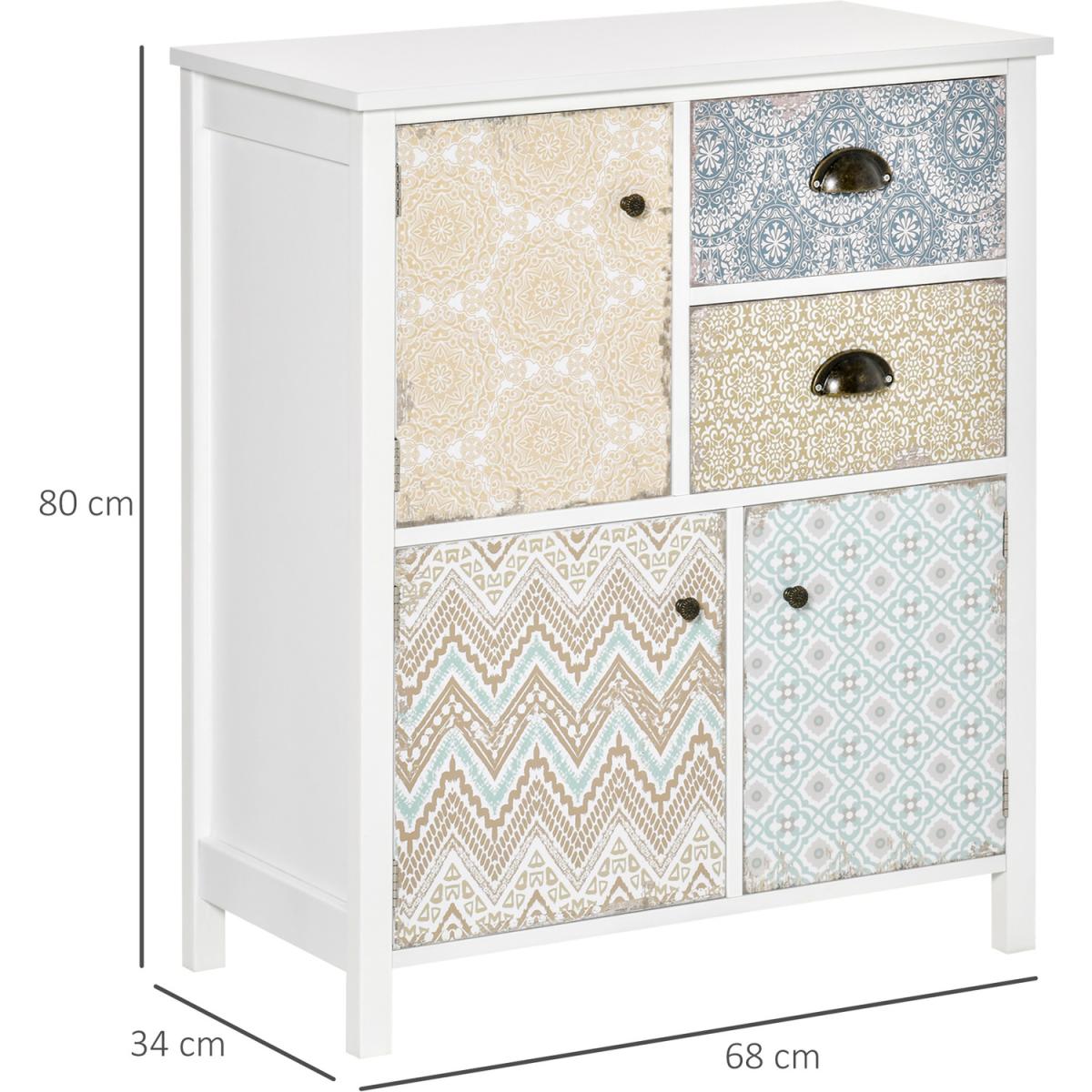Bring a beautiful bohemian vibe into your home with this storage chest from HOMCOM. The simple square frame is fitted with two drawers and three cupboards - each covered with a faded retro pattern that stands out against the white of the frame. Each drawer and door is fitted with a bronze-look handle which adds to the shabby-chic look of the unit. Using a tactile blend of wood and MDF, the strengthened structure ensures reliable everyday use, finished with a topcoat that protects against light water and marks. Let your living room speak volumes in complete style.