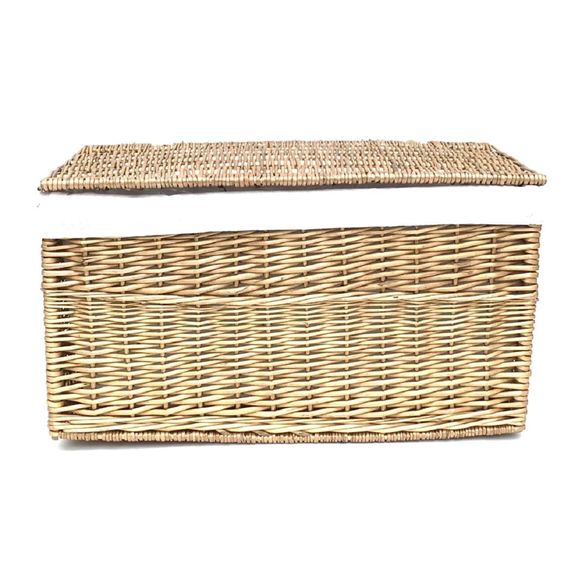 Finished in natural full wicker. Attractive looking. High Quality, well made Basketware. Natural product so dimensions can vary slightly. Manufactured from sustainable materials. Colours and finish could vary. Comes with removable cotton washable lining.