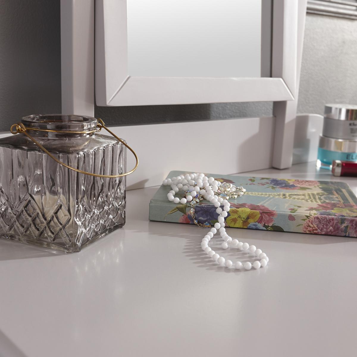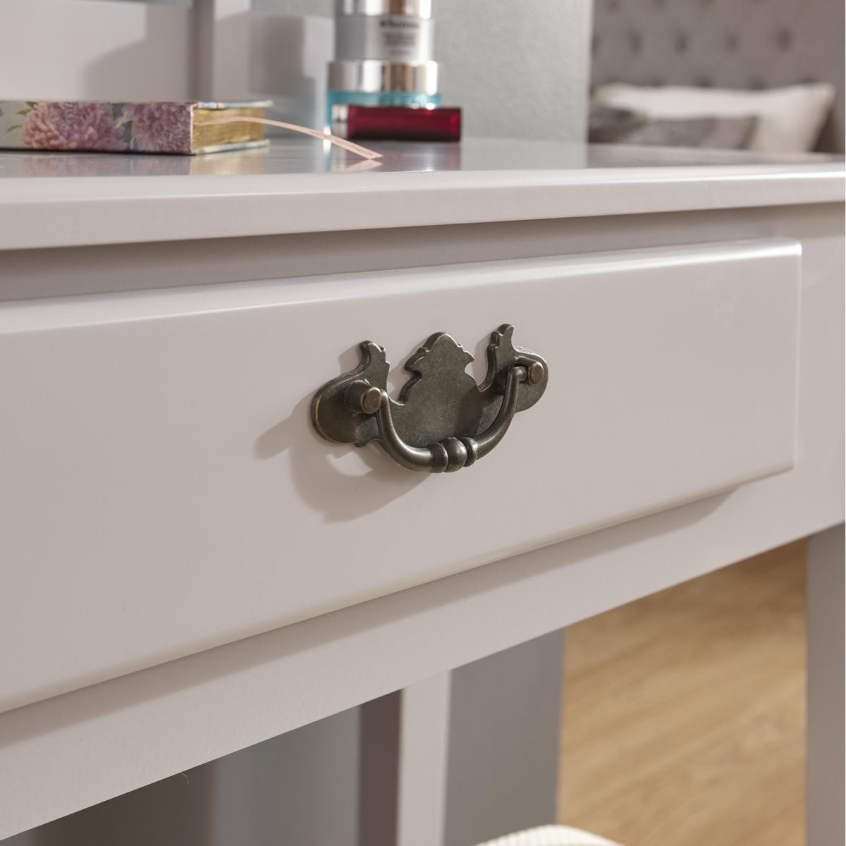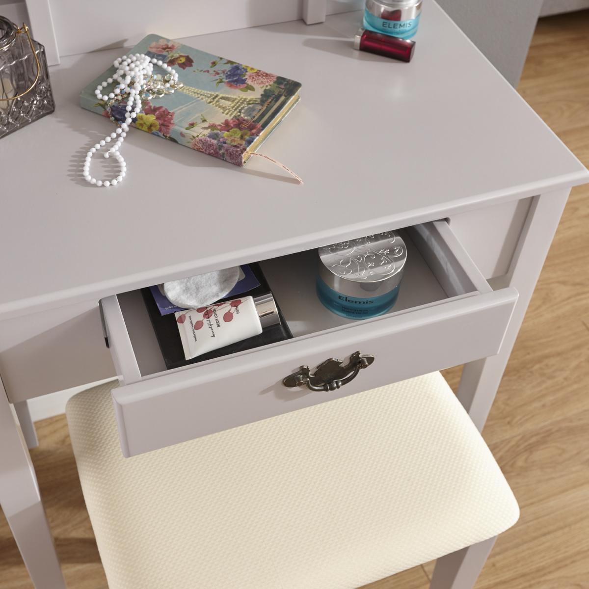 I love this dressing table set for its clean, versatile look that can easily fit into various interior styles, from classic to contemporary. Its grey finish offers a neutral yet sophisticated vibe, making it ideal for grey, white, or pastel-themed bedrooms. The setup works well in smaller spaces thanks to its compact design, and adding a vintage mirror or a few decorative trays can elevate the overall aesthetic. Practical styling tips include using the table's surface for organised pretties-think minimal jewellery or delicate perfumes-and pairing it with a cosy stool to keep the look inviting and functional. It’s a smart choice for those seeking understated elegance with practical charm.