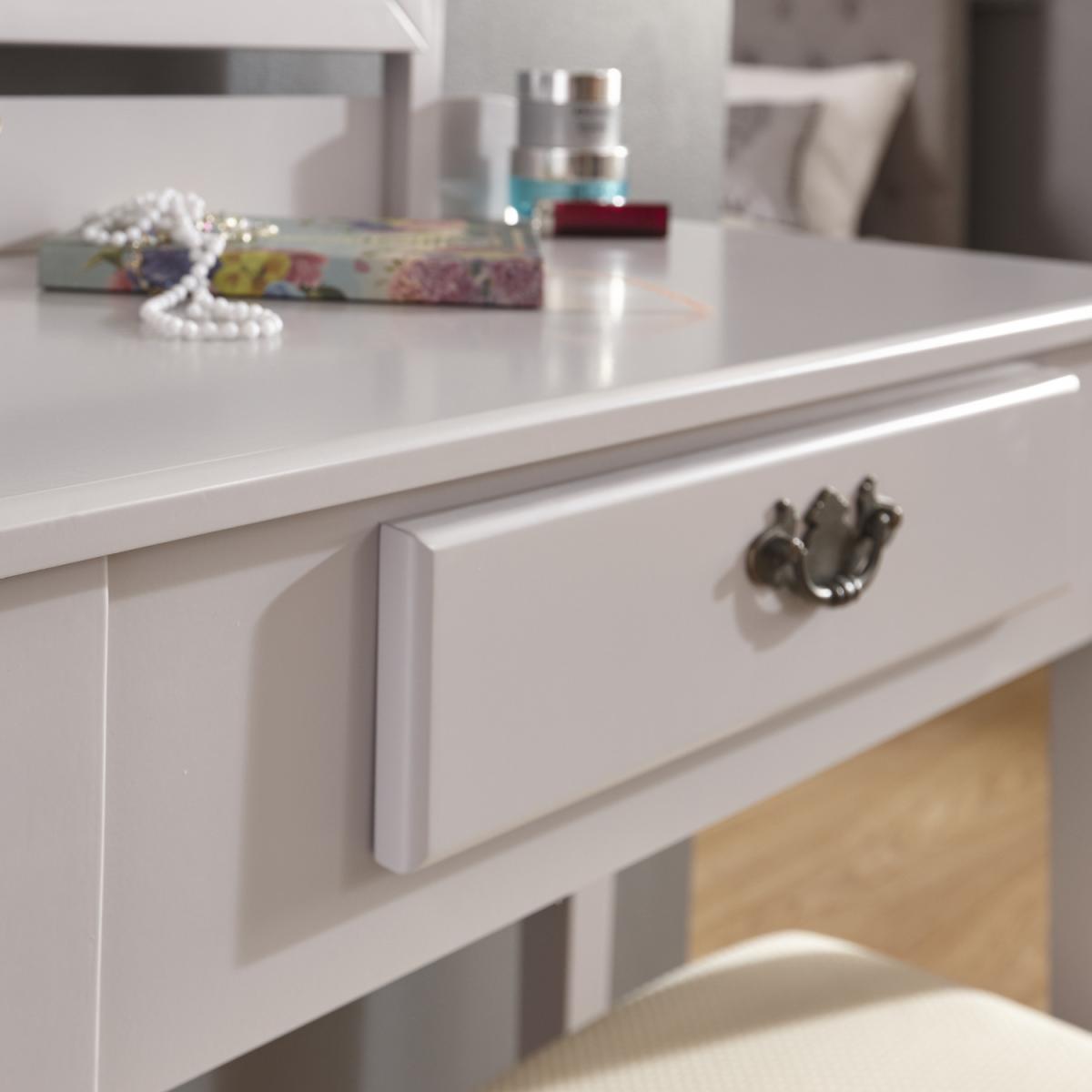 A contemporary, shaker-inspired design dressing table set in a choice of a white or black painted finish. The set includes the dressing table, adjustable mirror and the matching padded stool. Constructed from solid pine and MDF. Features a large drawer with wooden drawer runners and an antiqued handle. Rectangular framed mirror has an adjustable tilt. Cream fabric covered seat pad.