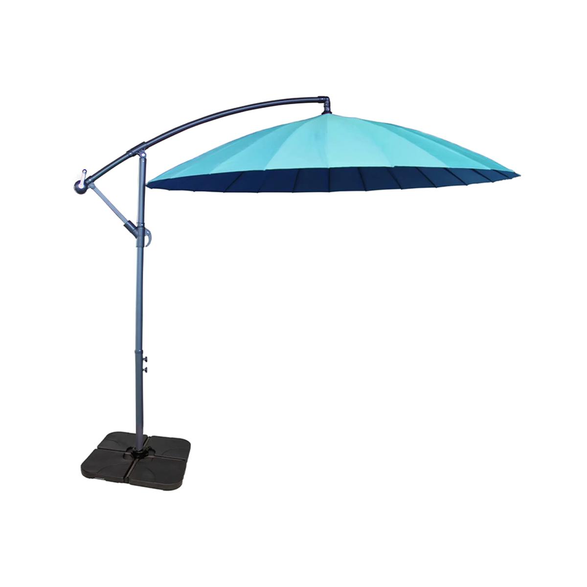 The 3m Shanghai Cantilever Parasol can be used as a free standing parasol provided you use a weighted base (not included) to keep the parasol in place. This product features an easy to operate crank system which will erect the canopy position when required. This cantilever parasol is made using a polyester fabric with a steel frame. THIS PARASOL DOES NOT COME WITH A WEIGHTED BASE. We recommend the water fillable base (for cross base cantilever parasols) for this product. Parasols provide shade, shelter from rain and a place to rest, while acting as an ornamental feature. A perfect way to add a classic modern style to bring your indoor fine dining outside while still having protection from the elements. The modern umbrella consists of a circular fabric or plastic screen stretched over hinged ribs that radiate from a central pole.