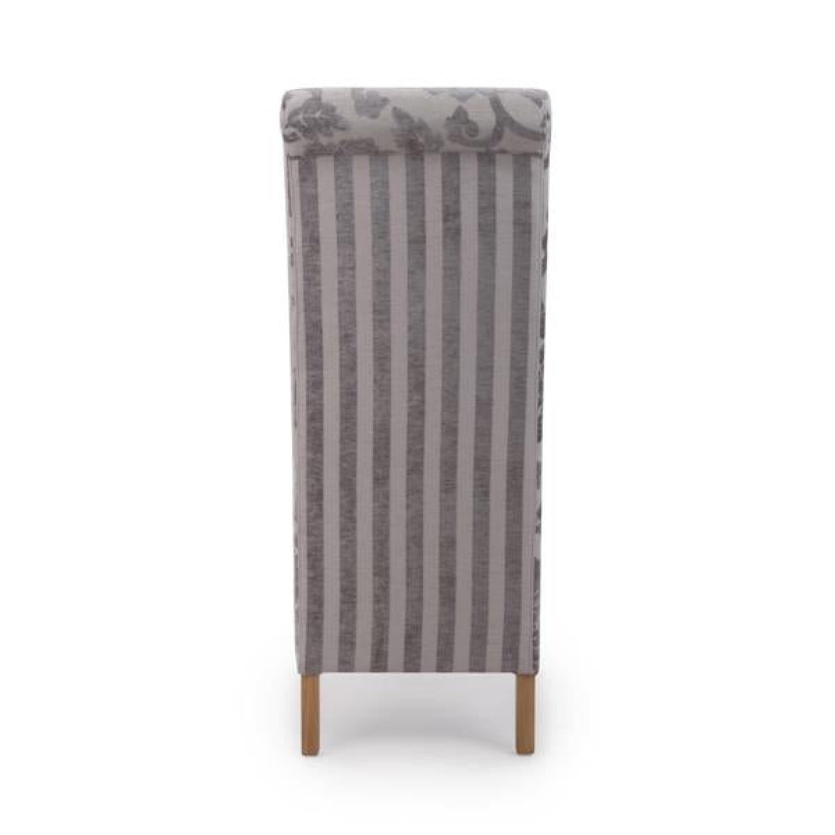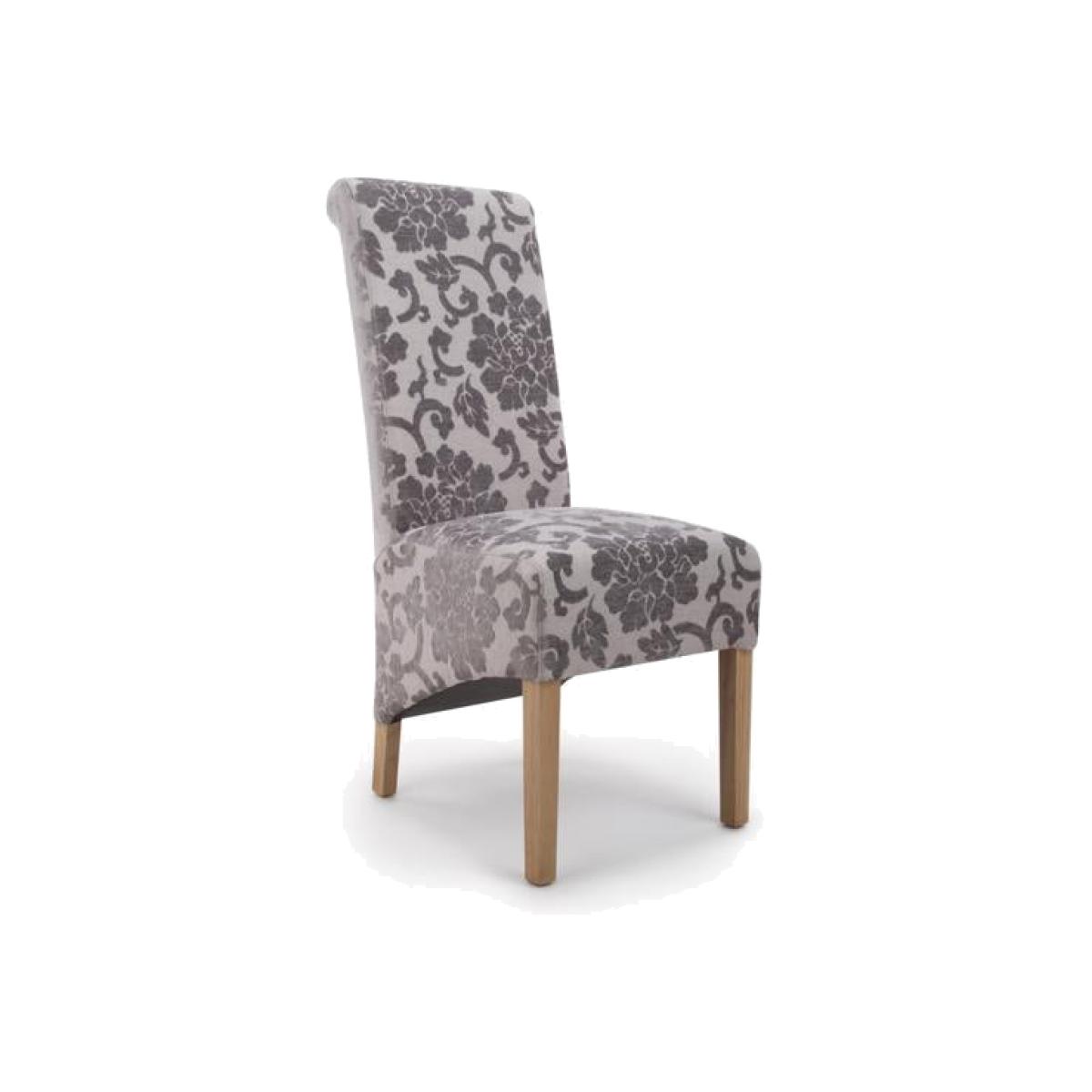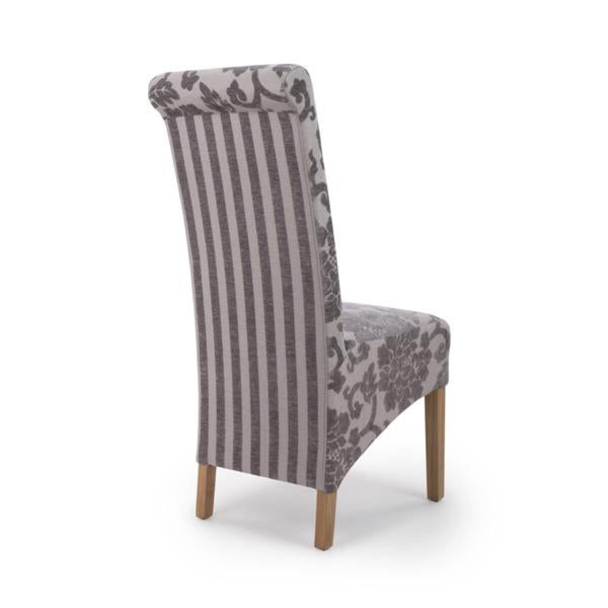 A classic roll back design dining chair, upholstered in floral baroque mink velvet with vertical striped back. Sprung and belted seat. Supplied with natural rubberwood legs. Fully assembled. Sold in boxes of 2.