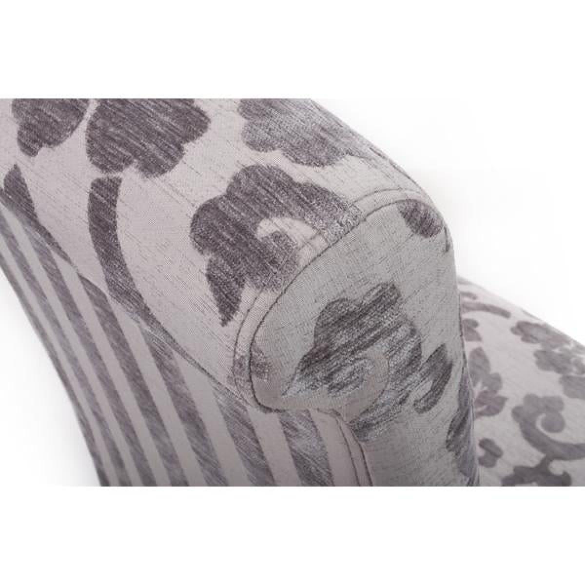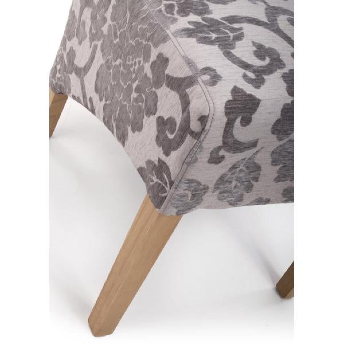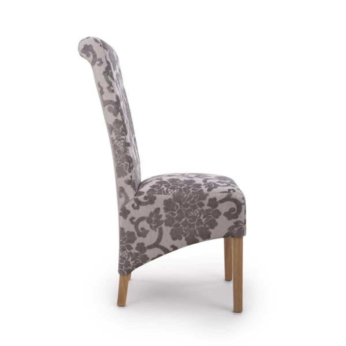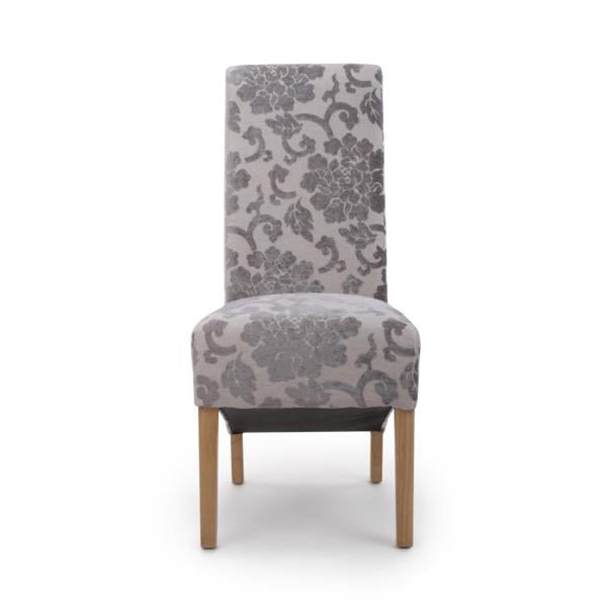 A classic roll back design dining chair, upholstered in floral baroque mink velvet with vertical striped back. Sprung and belted seat. Supplied with natural rubberwood legs. Fully assembled. Sold in boxes of 2.