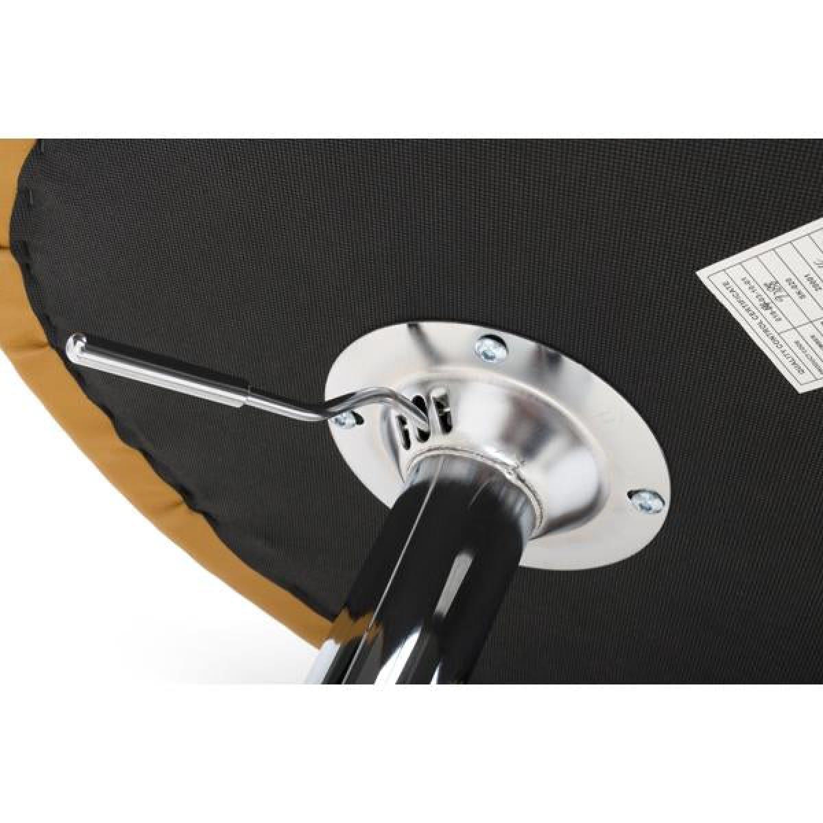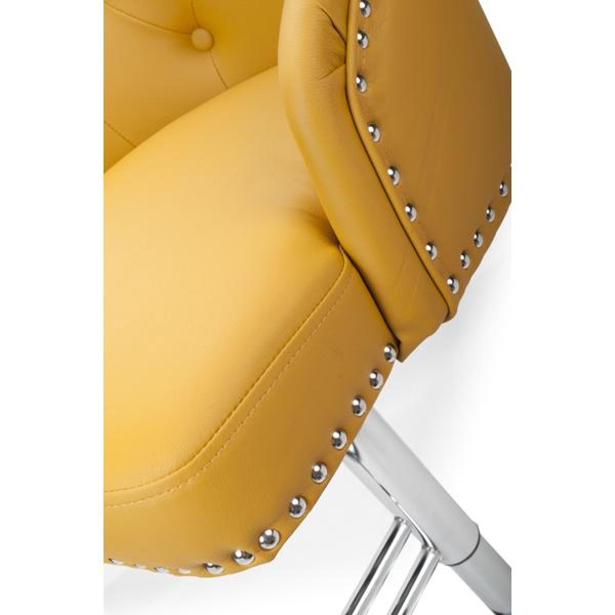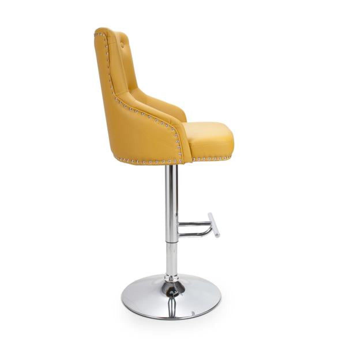 A gorgeous bar stool enhanced by attractive stud detail edging and tufted button back. Upholstered in yellow leather effect. Height adjustable up to 127cm. Complete with comfortable chrome footrest and base. Assembly required. Sold individually.
