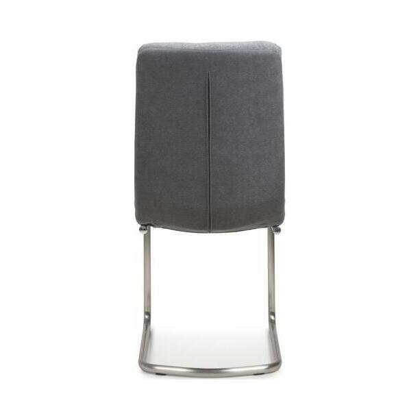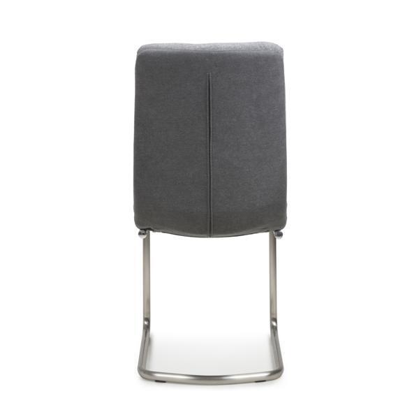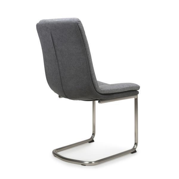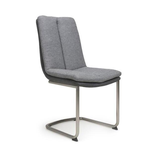 A stylish and unique twin layer linen effect dining chair. Light grey padded seat with vertical pleat. Dark grey rear with feature zip. Fitted with polished silver metal cantilever legs. Assembly required. Sold in boxes of 2.