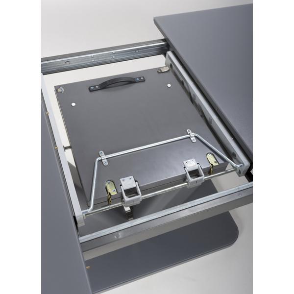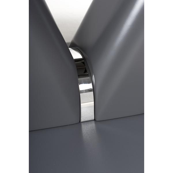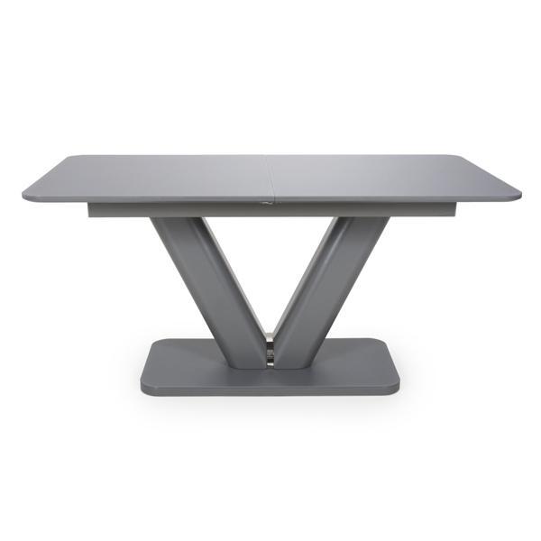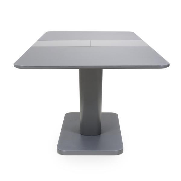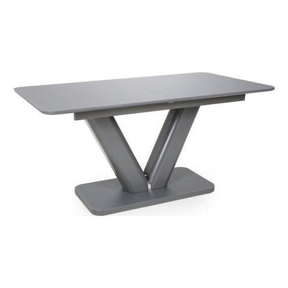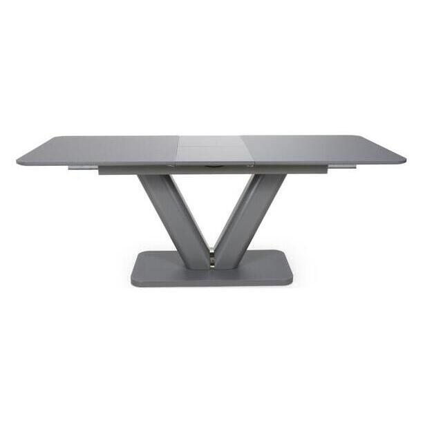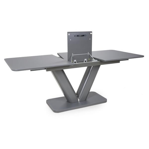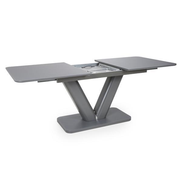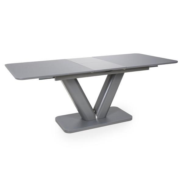 This solid dining table of contemporary design with a tempered glass top finished in a semi-gloss grey is a beautiful piece for any modern home. With it's smooth mechanism the table is easy to extend and the V design pedestal is giving a modern finish. Assembly required. Sold individually.