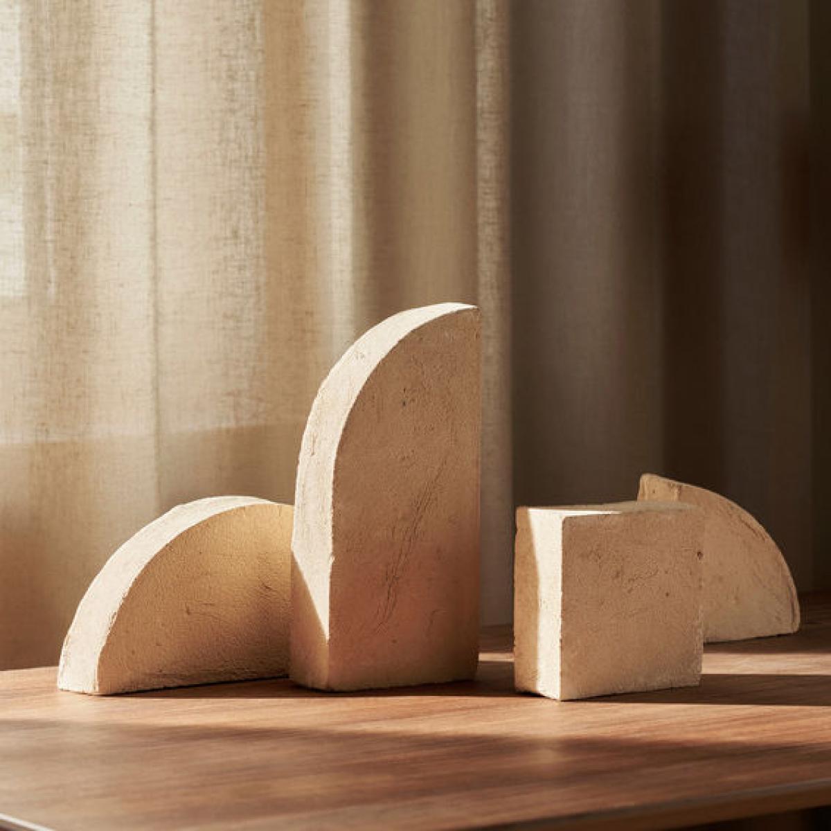 This set is composed of four pieces, hand-sculpted in Italy using the best clay from the River Po. Each piece has been formed by water, fire and human hands. The simple, geometric shapes come together and combine, creating graphic compositions. The irregular edges and coarse surface highlight the artisan and raw aesthetic. Each piece is unique and will add a tactile element to your home. Exhibit these pieces like sculptures, alone or grouped, or use them as decorative book-ends on shelving. Shape 1 (semi-circle): 12 x 5 x H 24 cm - Shape 2 (square): 12 x 5 x H 12 cm – Shape 3 (large): 12 x 5 x H 24 cm - Shape 4 (quarter-circle): 12 x 5 x H 12 cm