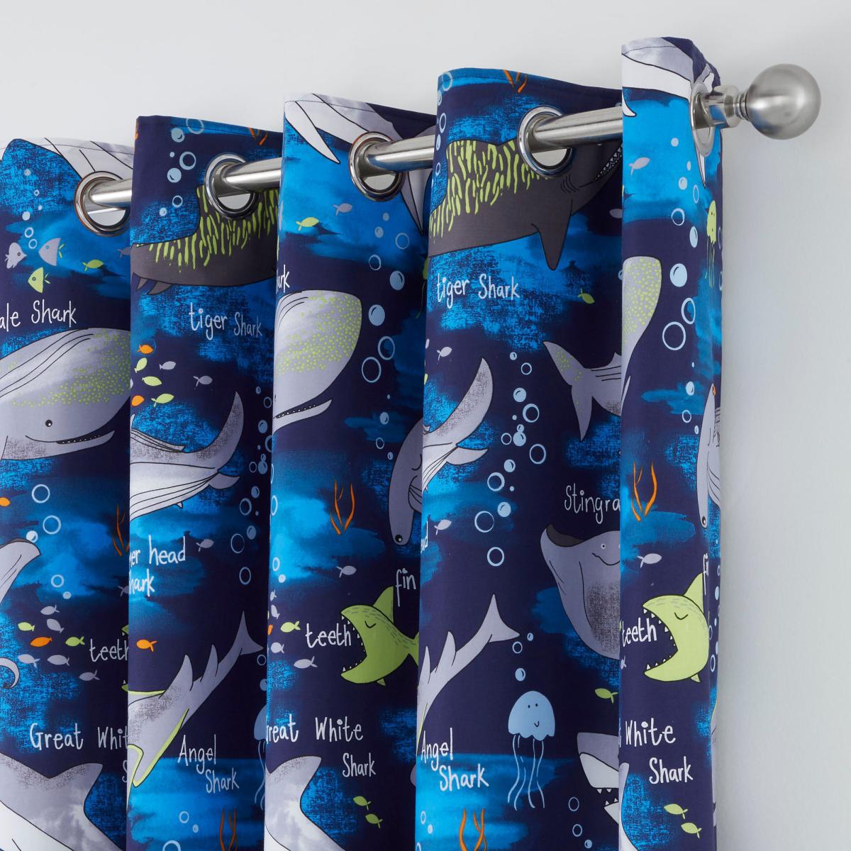 Designed with an eye catching bold shark print, this pair of eyelet header curtains are blackout lined to help eliminate unwanted external light and have been crafted from a soft polycotton blend. Complementing bedding and accessories available.