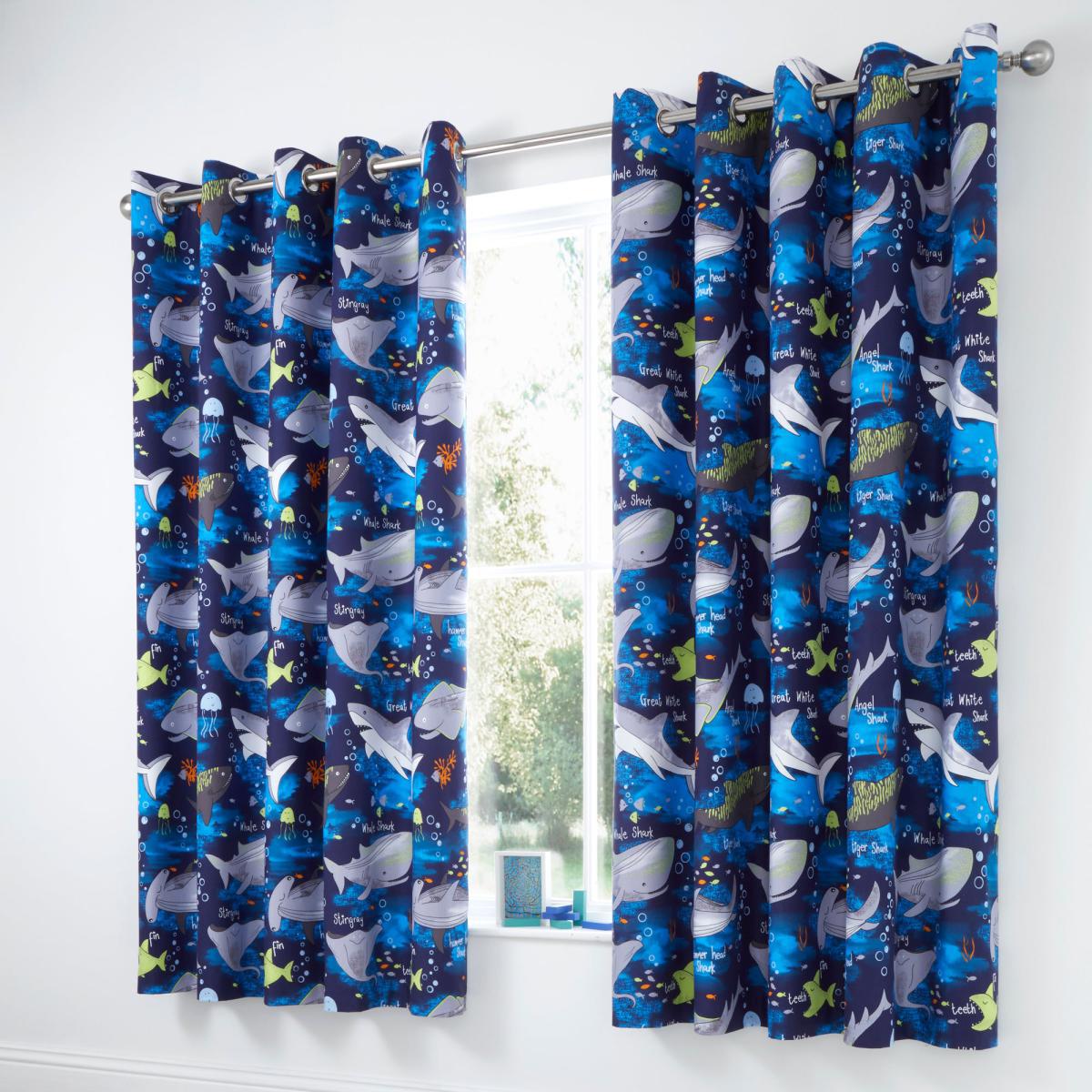 Sharks Navy Blackout Eyelet Kids Curtains Navy