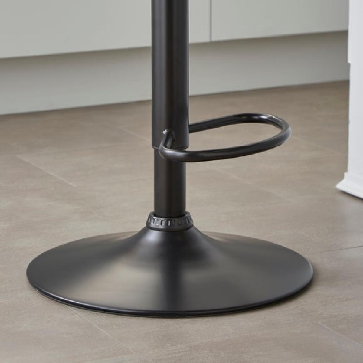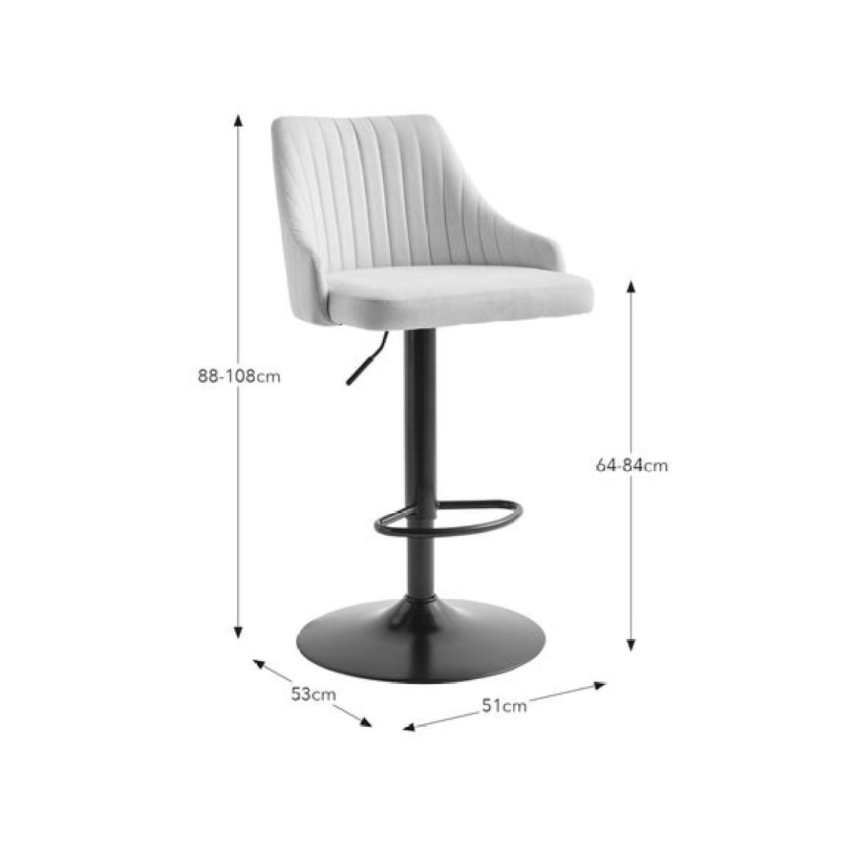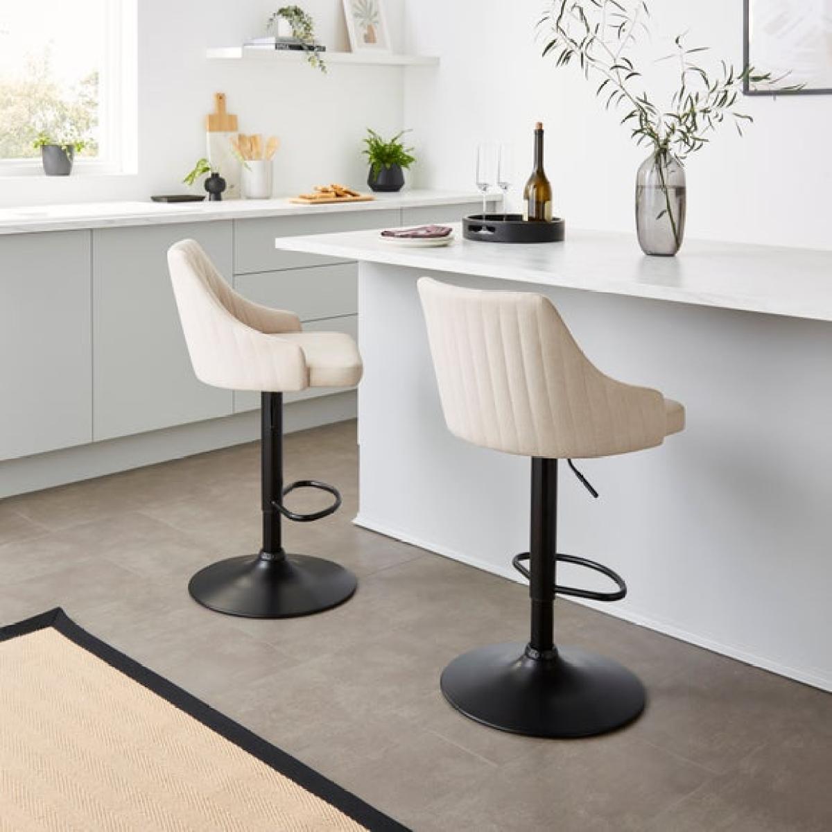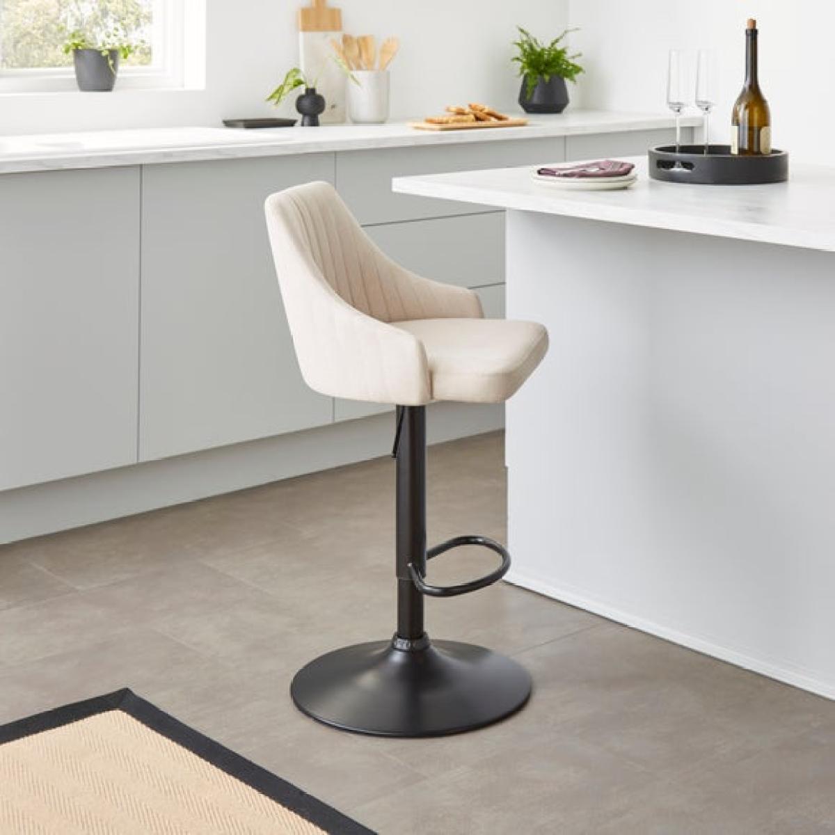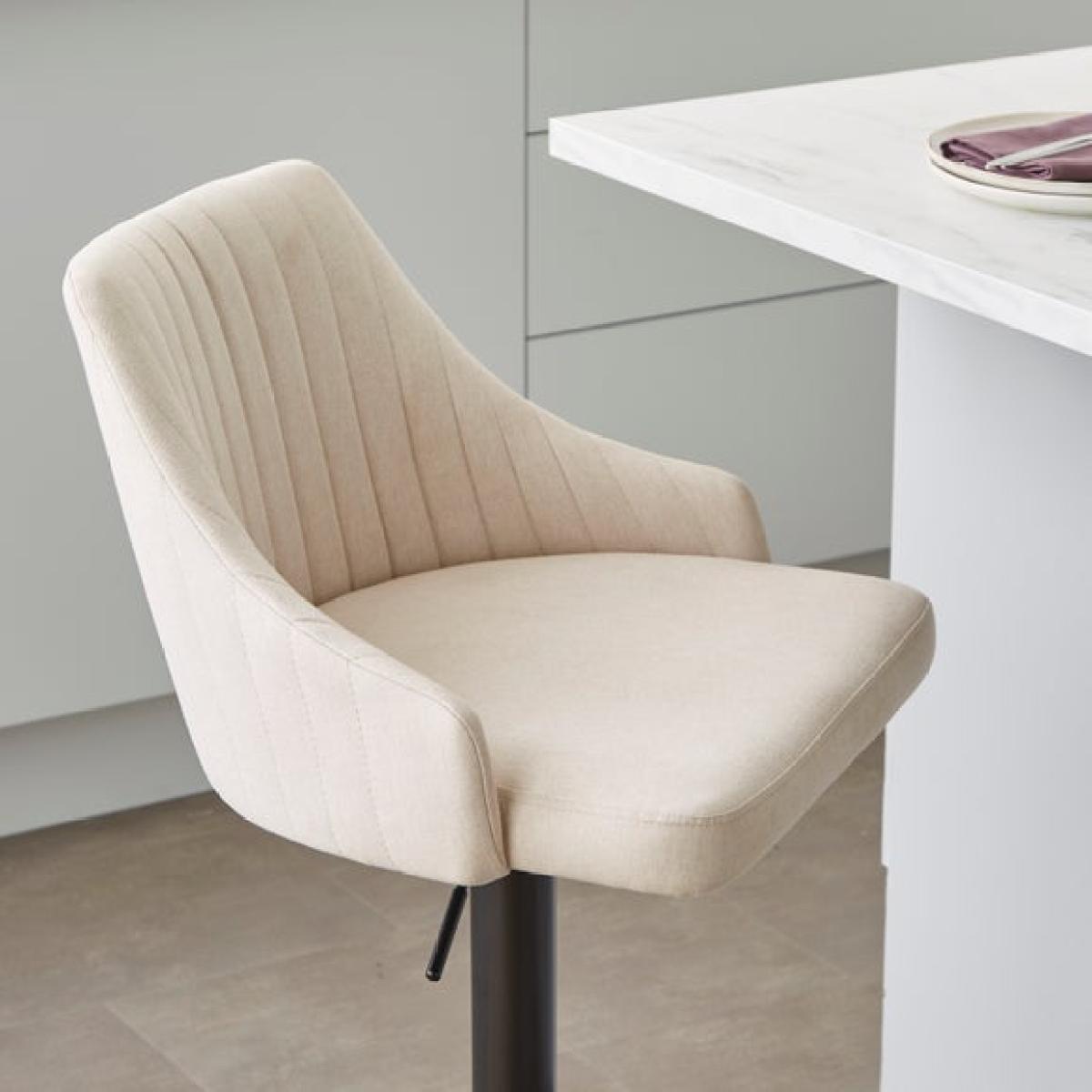 * Height adjustable stool * Metal leg * Soft upholstery Blending classic style with everyday practicality, this adjustable barstool is upholstered in a soft linen-effect fabric that adds a subtle texture to your space. The padded seat, high back and gently curved arms offer a supportive and comfortable sit, whether you're grabbing a quick bite or enjoying a relaxed drink. With an easy-to-use gas lift mechanism, you can adjust the height to suit your kitchen counter or breakfast bar, while the sturdy base and footrest provide added stability and comfort.
