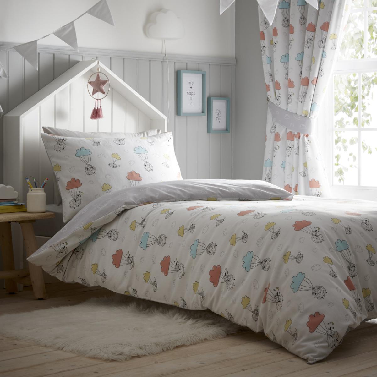 This loveable sheep print is perfect for young dreamers. Wonder off into the clouds with simply illustrated sheep floating off on their pastel-coloured balloons, and get comfy under the soft grey cloud print reverse.
