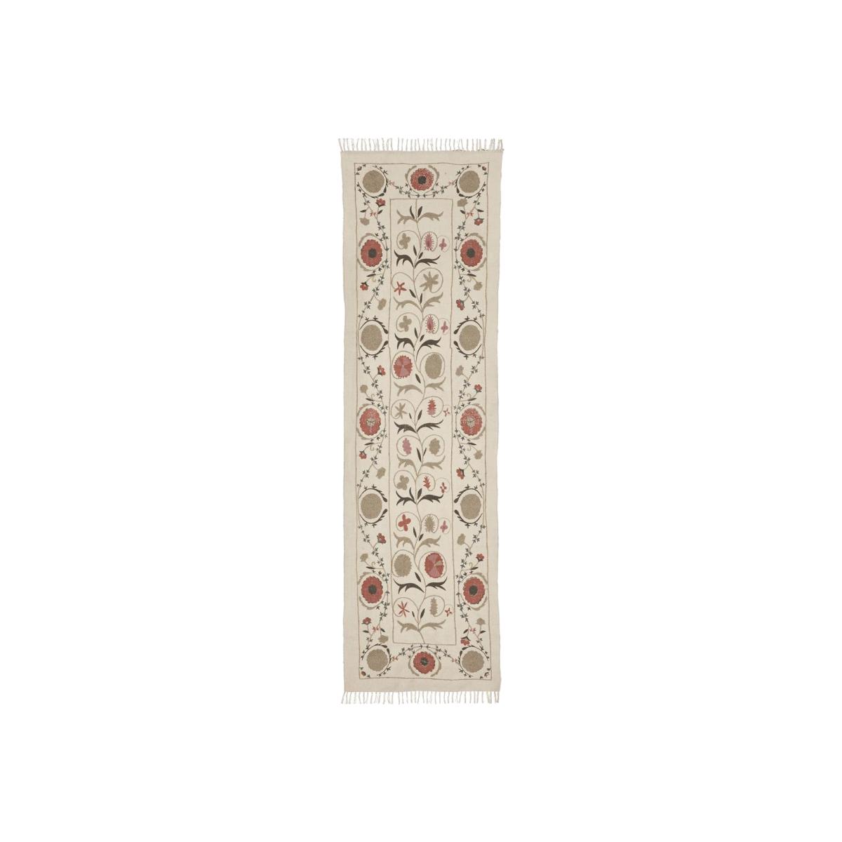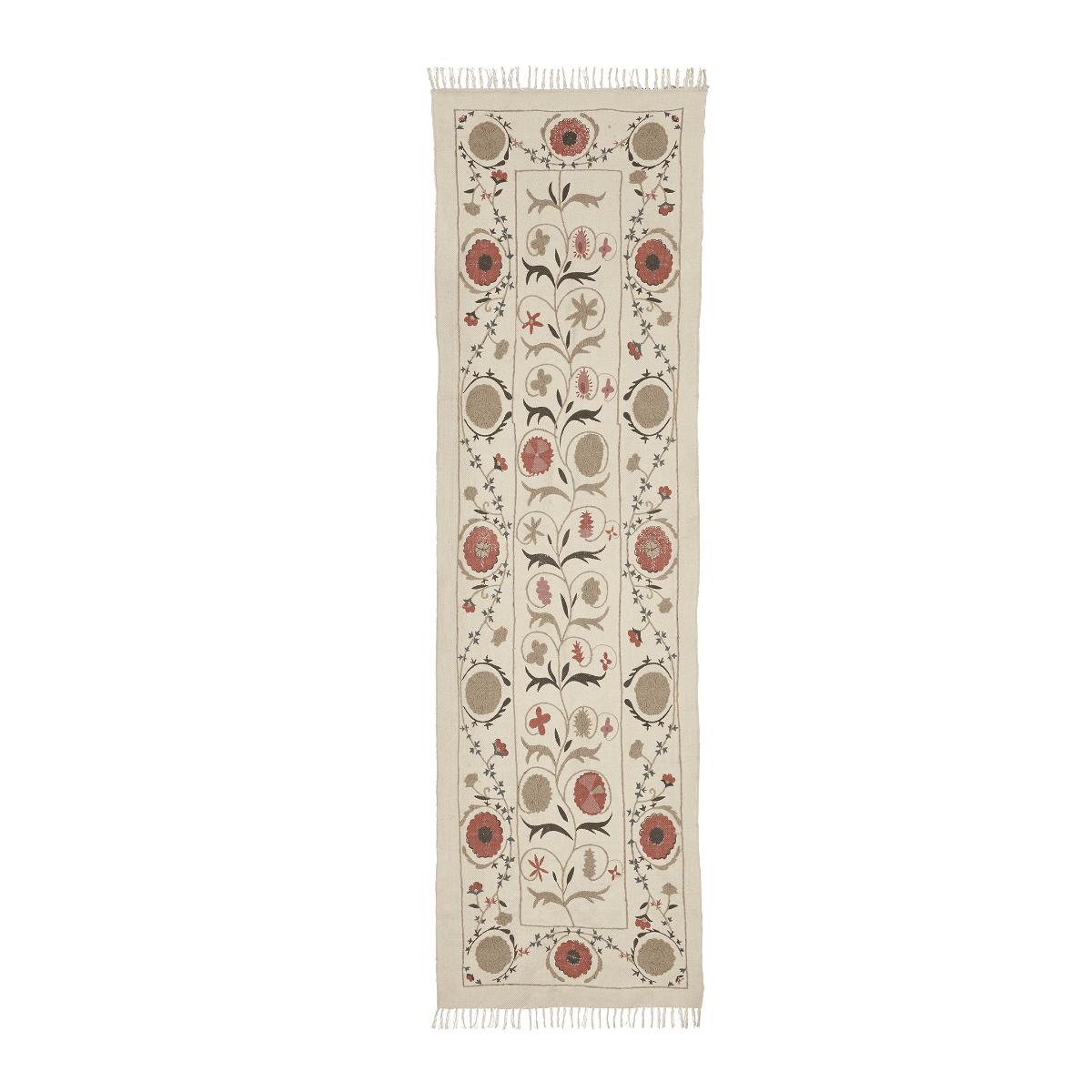 A natural-coloured, hand-knotted runner, crafted carefully from wool. Turn over a corner of the traditional floral design and you'll see the full extent of the work that goes into each rug; the stitches from the intricate hand embroidery are visible on the reverse. Due to the artisanal crafting process, each piece will have individual characteristics and no two pieces will be the same.