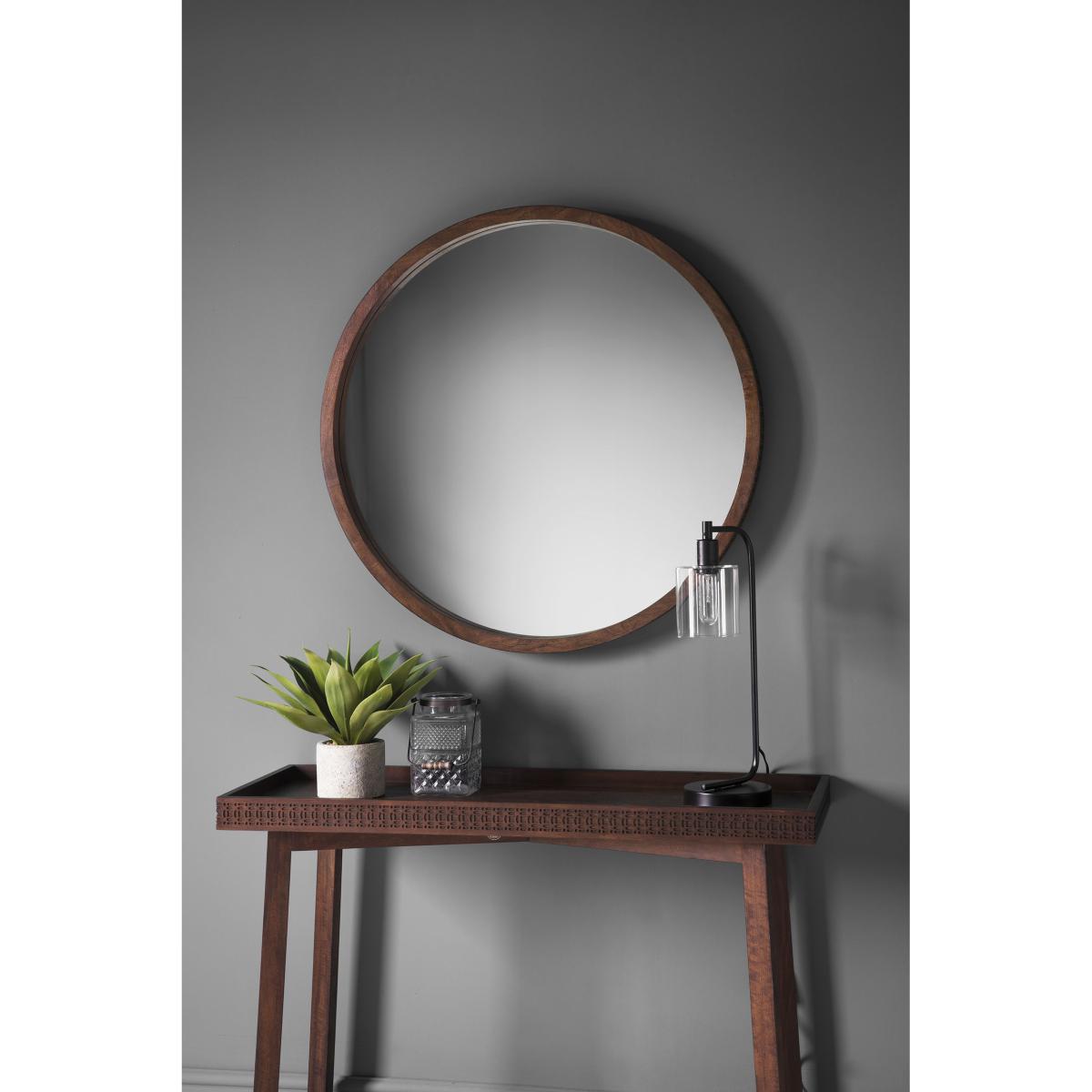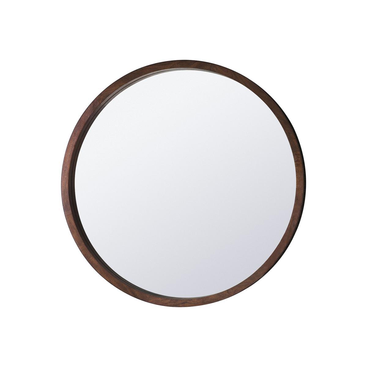 I love this round wall mirror because of its clean, classic shape and the rich dark wood frame which adds warmth to any space. It works well in both contemporary and traditional interiors, adding a touch of sophistication without overwhelming the room. Practical styling tips include placing it above a console table or mantel to enhance depth and light or leaning it against a wall in a dressing area for a relaxed vibe. Its versatile size makes it an ideal focal point in smaller living rooms or entryways, and pairing it with other wooden or metal accessories can create a cohesive, layered look.
