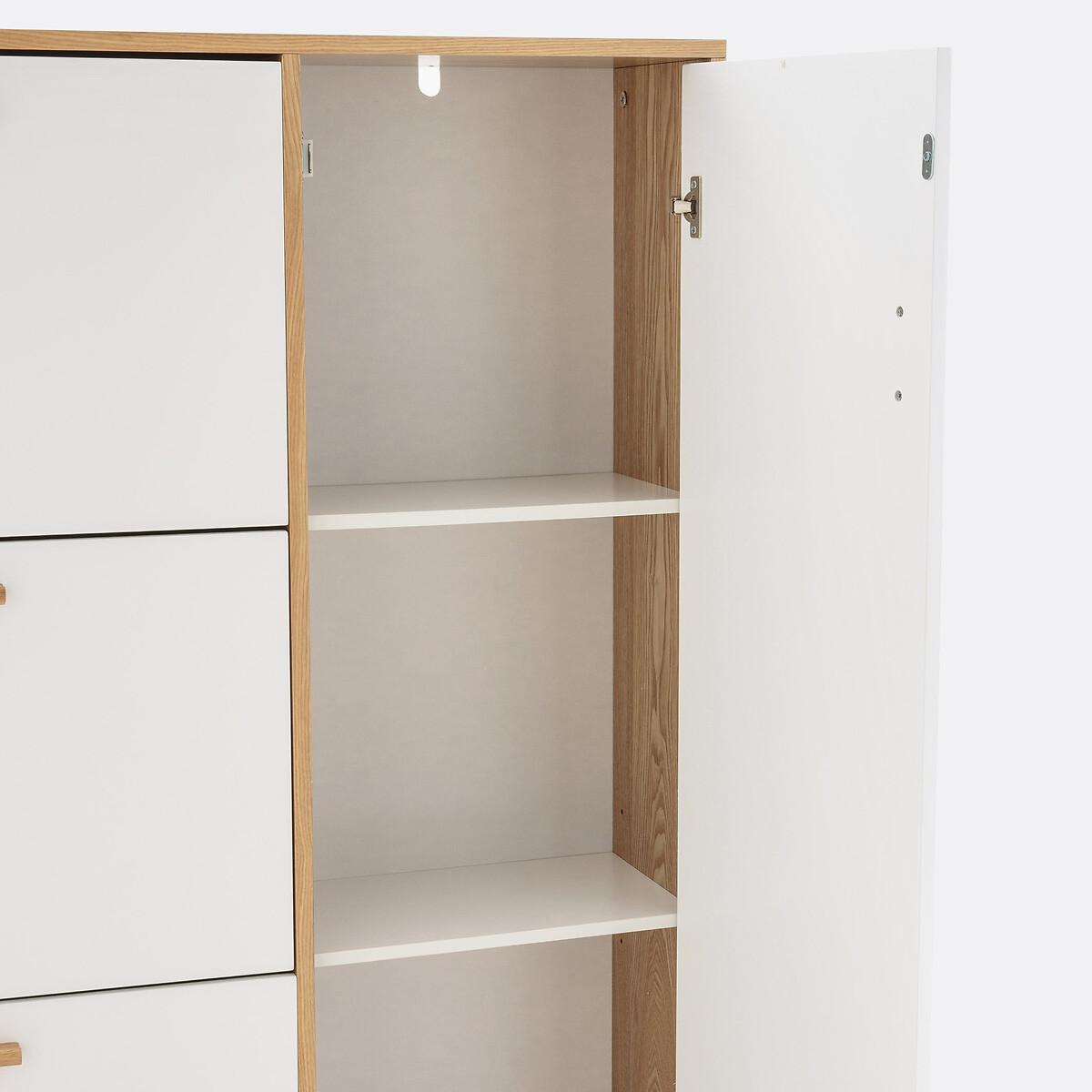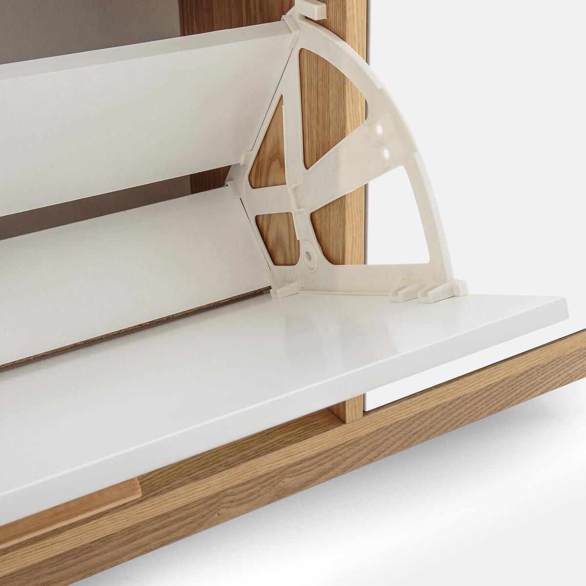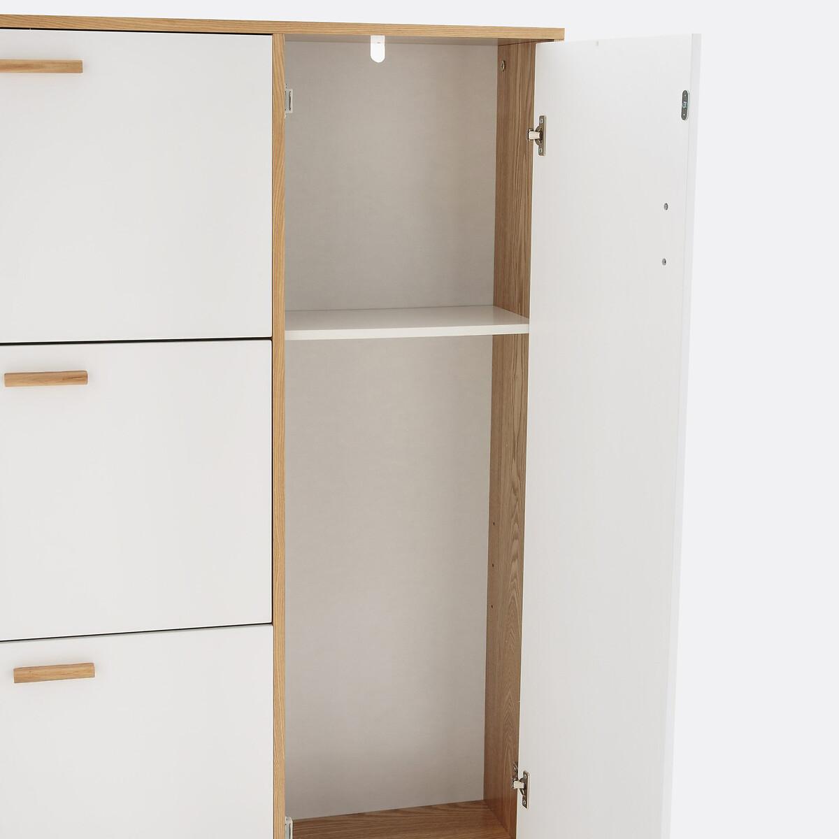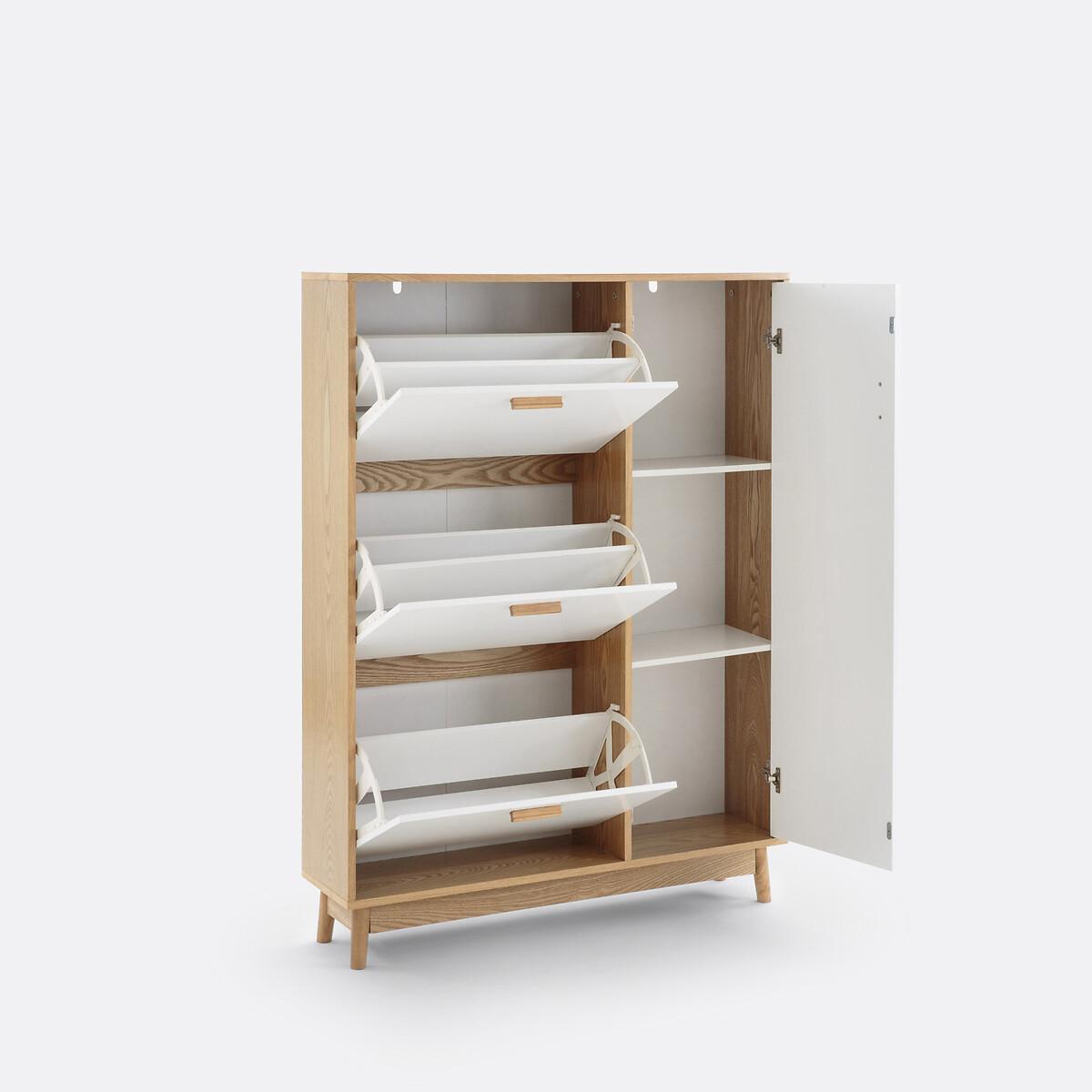 The ultimate in shoe storage, this Sheldon cabinet is a must for footwear fans everywhere. Inspired by the simplicity of Scandinavian design with 3 dedicated shoe storage areas and additional space for other essentials, it combines practicality with on-trend style.