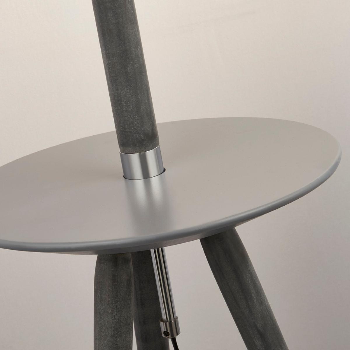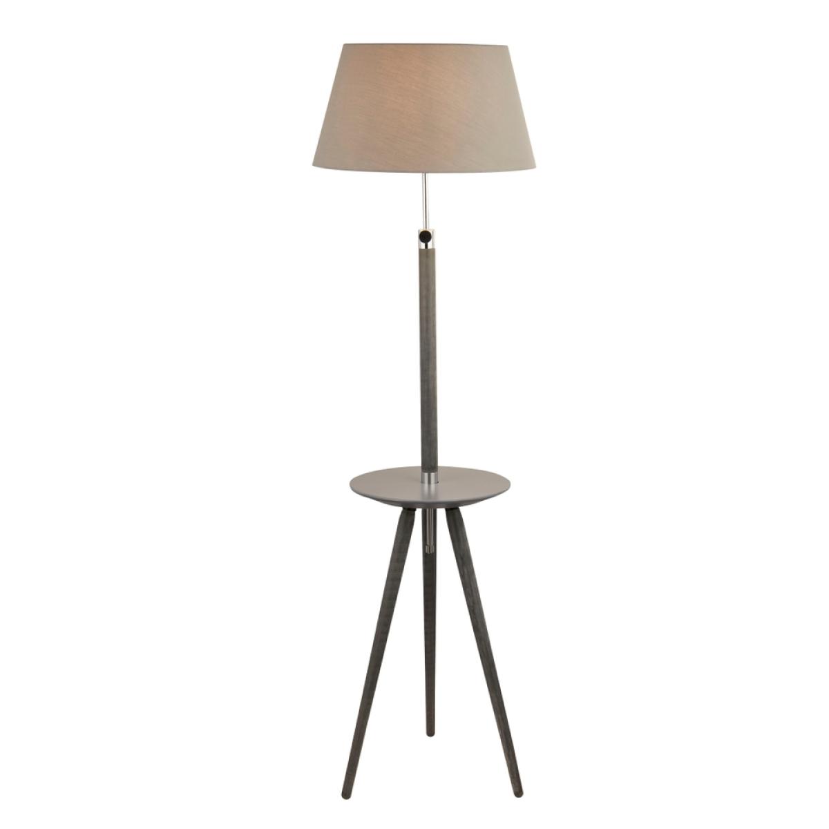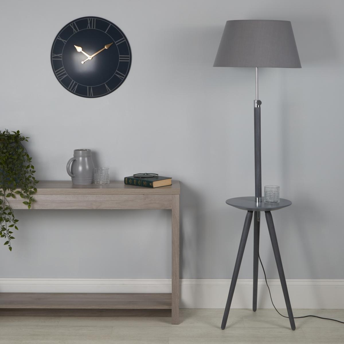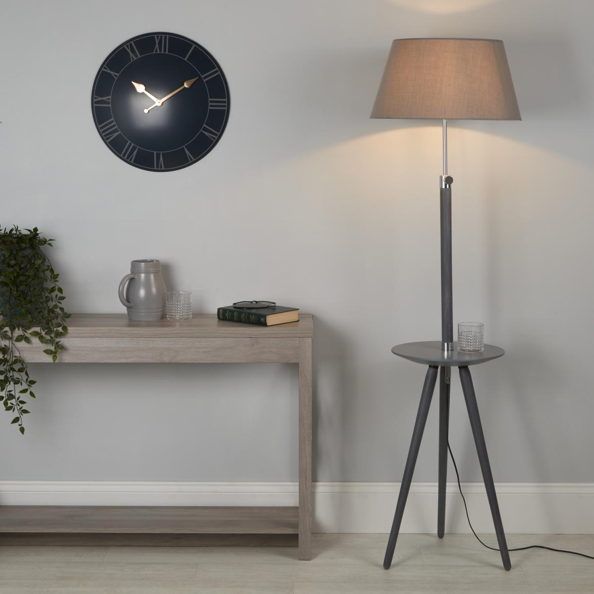 Fusing style and function, this shelf floor lamp is a simple way to illuminate any room, whilst also displaying decorative accessories. Ideal for a living room or hallway, this shelf floor lamp has a beautiful grey wood tripod base and shelf, topped with a grey fabric tapered shade, creating a stunning floor lamp which will work with any neutral modern decor. This lamp can easily be switched on and off with a gentle press with your foot due to the black inline switch.
