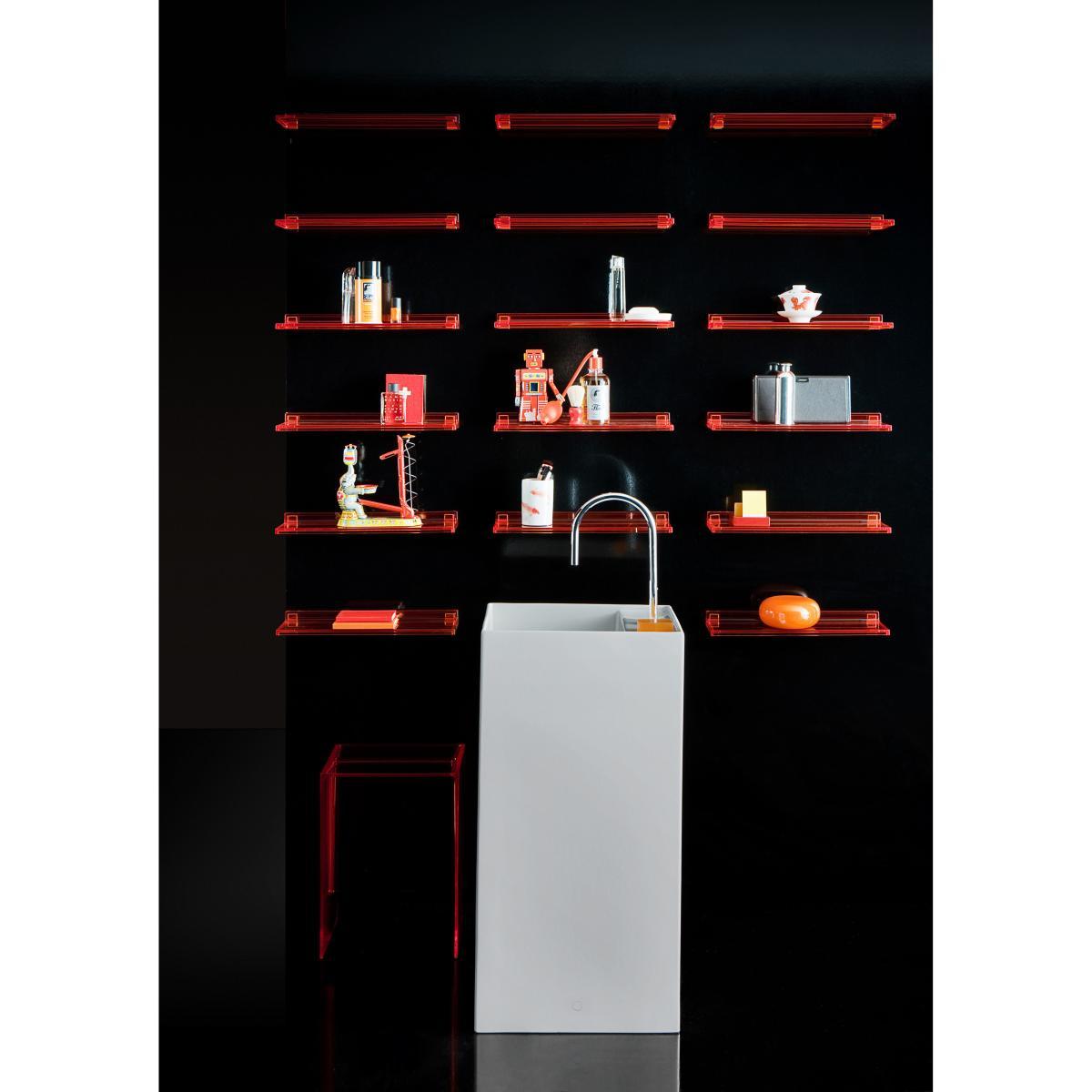 "Kartell now floods our bathrooms with an excellent collection of accessories signed by the Italian designers and architects, Ludovica & Roberto Palomba. A whole line of objects and small furniture that combine transparency and colours, refined and functional lines, refinement and simplicity. Made in PMMA, Shelfish bookshelf integrates well in all rooms by playing the transparency card. Colourful, it takes its good mood everywhere: bathroom, entrance, kitchen. Thanks to the simplicity and purity of the shape, Shelfish can be indefinitely multiplied for a mimetic, evanescent and discreet effect. The "Kartell by Laufen" collection is the fruit of the collaboration between the Kartell brand and the Swiss house Laufen, ceramics specialist. Under the artistic direction of Ludovica + Roberto Palomba, this bathroom project is very complete and uses of both companies' expertise. The patented ceramic sinks and bathtubs find their counterpoint in the multicoloured light from the plastic accessories. ".