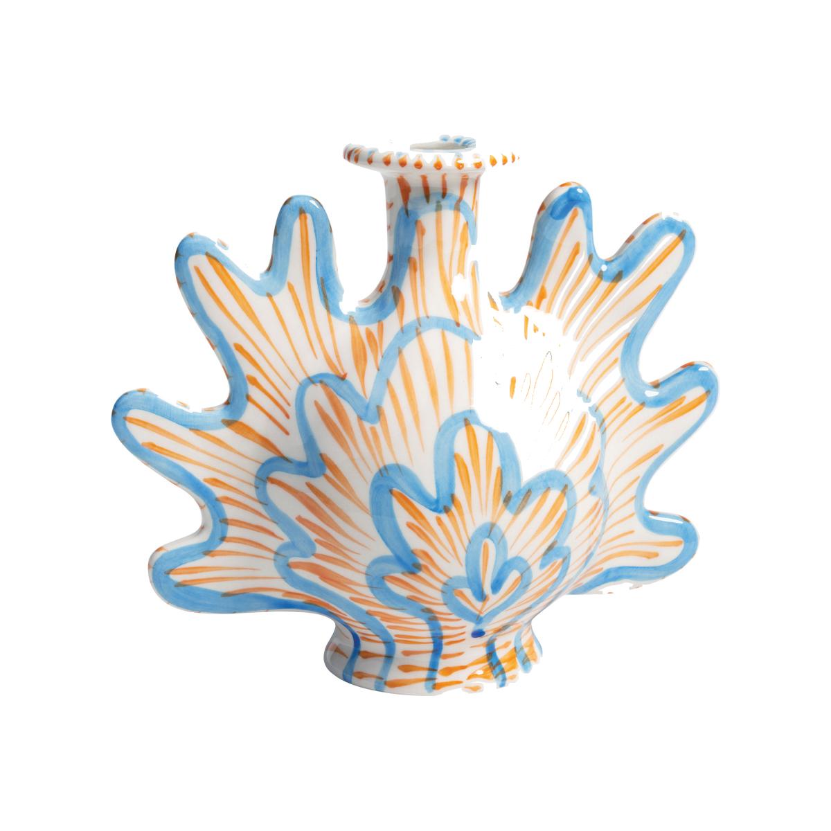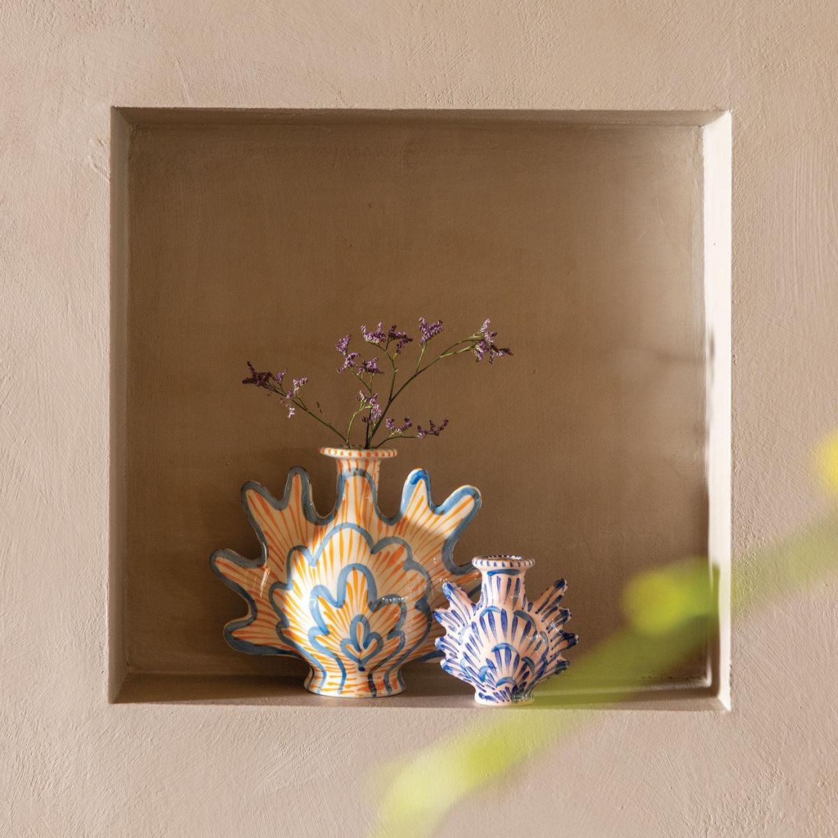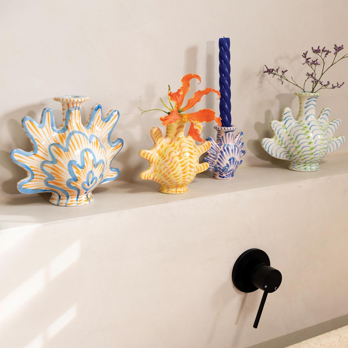 Throw yourself into summer with this collection designed by South African painter Lucie De Moyencourt. Joyful and colourful, these ceramic pieces inspired by the marine world bring a breath of freedom and good humour to your decor! Undulating corals and seashells give your home a holiday feel. This candle holder can also be used as a vase for small flowers.